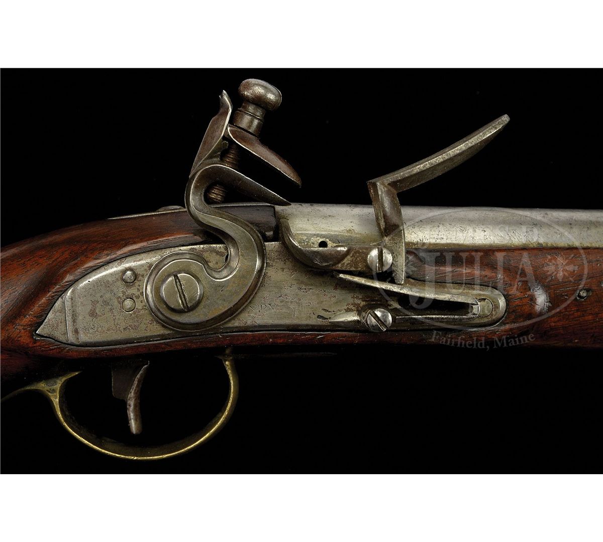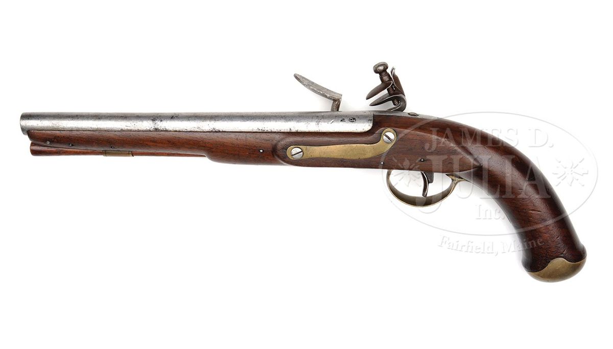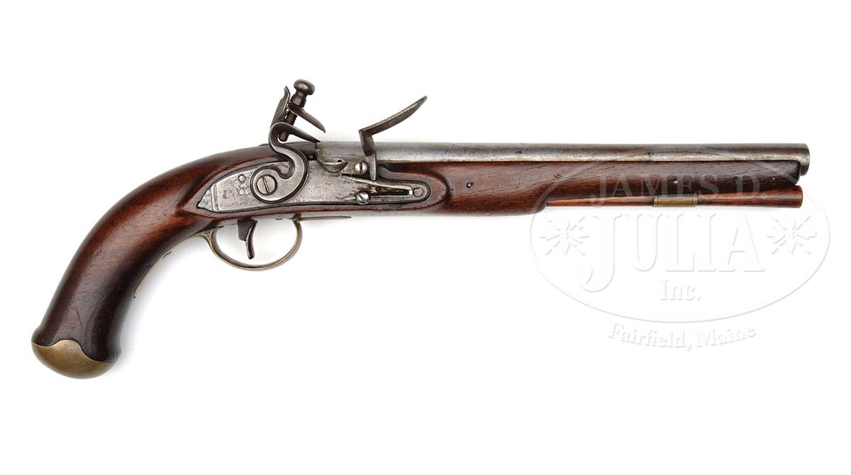 NSN. Cal. .62 smoothbore. Joseph Henry, Philadelphia, flintlock pistols are similar to the 1807-1808 contract types. These pistols are believed to have been made for State Militia contracts as well as for private sale. Pistol has 10" round iron bbl. Walnut stock is pin fastened with brass mountings and the flint lock is marked “HENRY” ahead of the hammer. Bbl is marked with a single “P” in an oval proof. PROVENANCE: Collection of Woody Frey CONDITION: Fine condition throughout. 4-48482 RG31