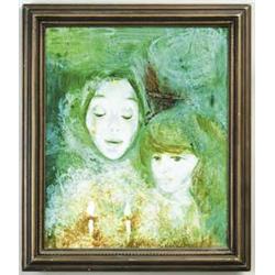 Lot 1582 JOSEPH ISSAC (Hungarian, 20th Century) CANDLE VIGIL. Acrylic on masonite scene shows two women, one with head wrap, other with long brown hair, stand in front of two lit candles. Green background. Signed lower right “Issac”. Housed in a molded wood decorated frame. Joseph Issac was featured in Time Magazine in 1969 and referred to as one of Budapest’s famous artist’s. SIZE: 24” x 20”. CONDITION: Good. 9-94552 (300-500)