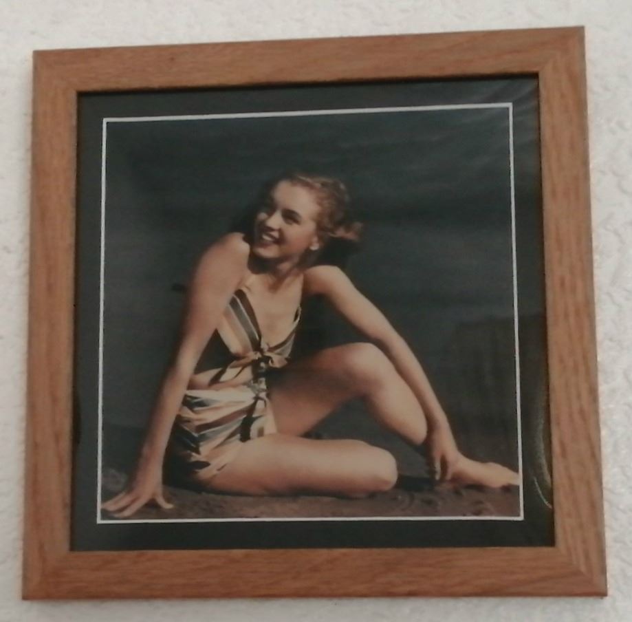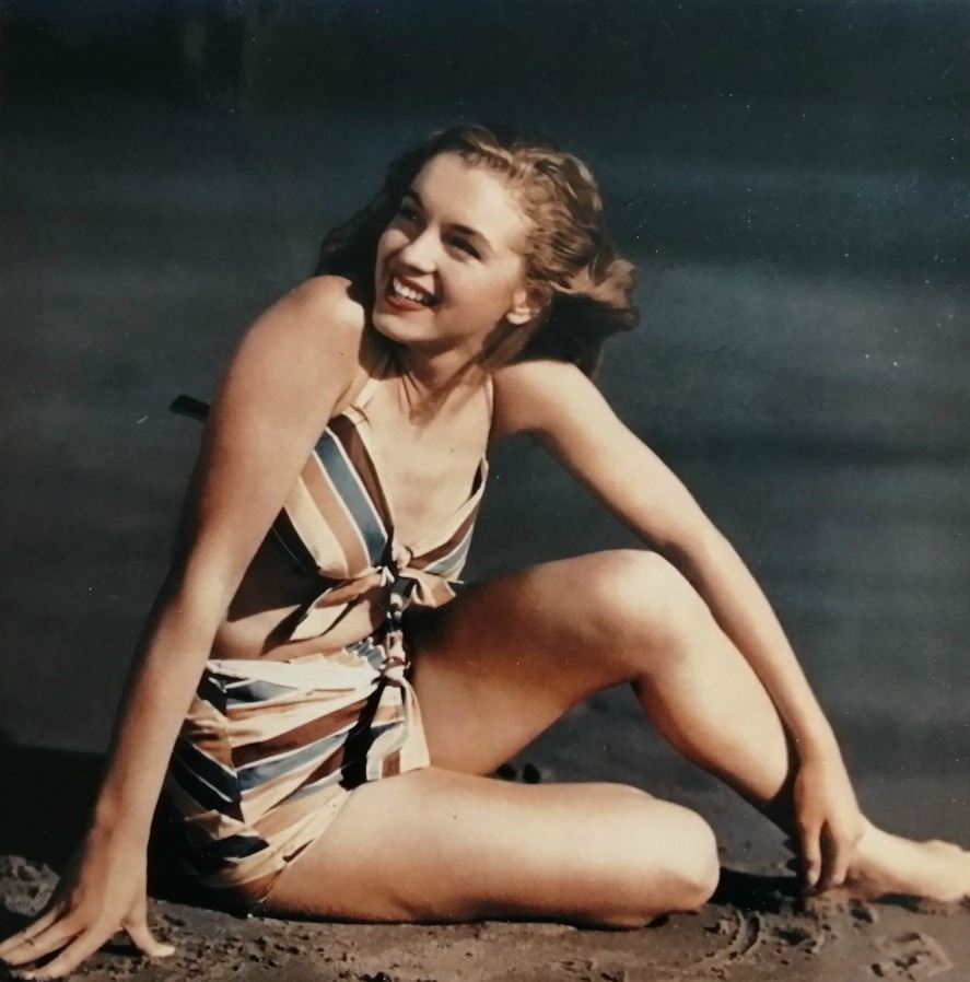 Marilyn Monroe at Zuma Beach, California in 1946. Printed later by photographer: Joseph Jasgur. Size: 7.5x7.5 inches. Stamped on verso.