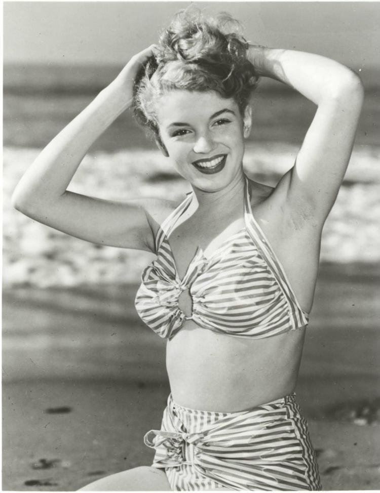 Silver gelatin photo. 10x8 inches. Printed by Joseph Jasgur of Marilyn at Zuma beach in 1946.