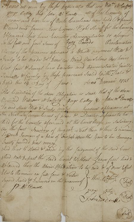 (1756-1801) An American planter, soldier, and statesman from North Carolina known as "Quaker Meadows Joe" to distinguish him from his cousin Joseph "Pleasant Gardens" McDowell, who was also a legislator and Revolutionary War officer. Commanded militiamen at the Battle of Kings Mountain, also fought at the Battle of Cowpens. Manuscript D.S. 2pp. folio, Rowan Co., NC, June 14, 1775, a court judgement awarding forty pounds, also signed by his brother JOHN MCDOWELL. Weak folds, a few marginal chips and tears, still generally quite good.