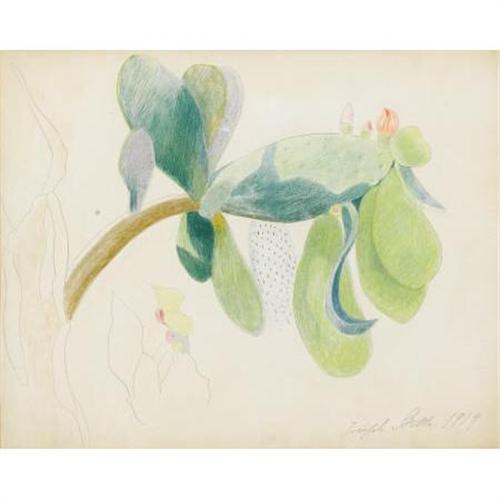 <B>JOSEPH STELLA </B></I>(American 1877-1946)<BR><I>Prickly Pear Cactus Fruit</B></I>, 1919<BR>Silverpoint and crayon on paper<BR>10-1/2 x 13-1/4 inches (26.7 x 33.7 cm)<BR>Signed and dated lower right: <I>Joseph Stella 1919</B></I><BR> <BR>Provenance:<BR>Rabin & Krueger Gallery, Newark, NJ<BR>Private collection, Oregon<BR><BR>Born in Muro Lucano, Italy, Joseph Stella emigrated to New York in 1896. His first major retrospective was mounted in 1963 at the Whitney Museum of American Art in New York. This was the first exhibition to hang his futurist paintings alongside his works inspired by nature. Arguably, his most well-known paintings are <I>Brooklyn Bridge</B></I>, Yale University Art Museum, and the <I>Tree of My Life</B></I>, private collection, both of which were painted in 1919-1920. They exemplify the dynamic duality of technology and nature that separated Stella's works from those of the other American Modernists. Both of these iconic paintings by Stella were created during the same year as this sensitive metalpoint drawing. In fact many of the artist's tropical metalpoint drawings, like the present work, appear in the elaborate <I>Tree of Life </B></I>composition. <BR><BR>The present drawing is typical of Stella's virtuosity with a medium that was used widely during the Italian Renaissance. It is relentlessly sharp-edged, such that even the curvilinear shape of the petal, for example, does not undulate. Despite its hard-edged quality, silverpoint is capable of creating the gentlest tonal gradations, which in the hands of an expert draftsman like Stella yields imagery with marvelous sculptural properties. <B>Condition Report:</B> Slight staining to edges due to old matting, otherwise overall good condition.<BR><BR><b>Shipping:</b> Requires 3rd Party Shipping (<a target="_blank" href="http://www.heritageauctions.com/common/shipping.php">view shipping information</a>)