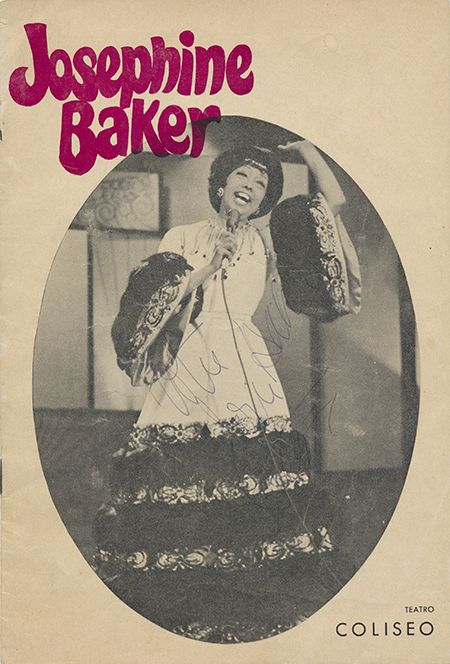 (1906 - 1975) Black American entertainerand a European sensation, renowned for her jazz singing, dancing and extravegant costumes. A program signed "Josie Baker, 1971" on the cover, from her concert in Buenos Aires, Argentina at the Teatro Coliseo. Signature partially over a darker portion, otherwise very good condition.