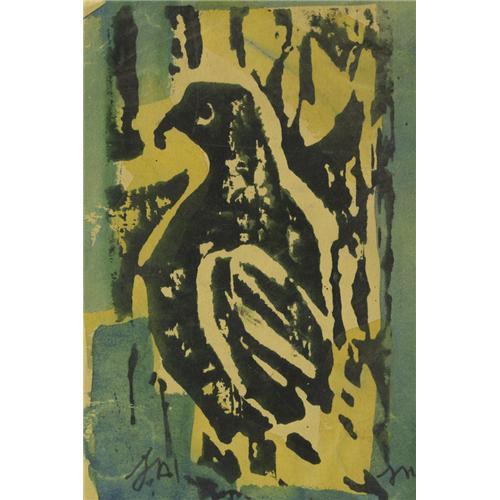 <B>JOSEPHINE MAHAFFEY (1903-1982)</B></I><BR>Untitled Bird<BR>Color-block print<BR>6 1/2in. x 4 1/2in.<BR>Signed lower left<BR><BR>Provenance:<BR>Estate of Josephine Mahaffey<BR>Acquired from the above by the present owner<BR><BR> <B>Condition Report:</B> Excellent condition. Unframed.<BR><BR><b>Shipping:</b> Requires 3rd Party Shipping (<a target="_blank" href="http://www.heritageauctions.com/common/shipping.php">view shipping information</a>)