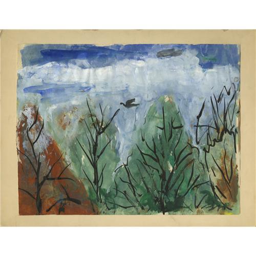 <B>JOSEPHINE MAHAFFEY (American, 1903-1982)</B></I><BR>Untitled, landscape<BR>Watercolor and acrylic on paper, mounted on mat board<BR>Signed to lower right <I>JM</B></I><BR>10-3/4in. x 13-3/4in.<BR><BR><BR><BR><b>Shipping:</b> Flat Material, Small (<a target="_blank" href="http://www.heritageauctions.com/common/shipping.php">view shipping information</a>)