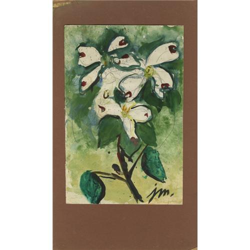 <B>JOSEPHINE MAHAFFEY (American, 1903-1982)</B></I><BR>Untitled Floral<BR>Watercolor and pencil on paper, mounted on mat board<BR>Signed to lower right <I>JM</B></I><BR>16.5in. x 9.5in.<BR><BR>Josephine Mahaffey attended the College of Industrial Arts (now Texas Woman's University) and after graduation continued her studies with Sallie Blythe Mummert. Additional instruction was with Clinton King, Octavio Medellin, Kathleen Lawrence, and John Erickson. For many years she ran her own art gallery in Azle and taught watercolor classes in Fort Worth. Josephine was a fixture at Fair Park and the State Fair of Texas selling her art. In 1968, she was honored with the naming of 'Josephine Mahaffey Day" at the State Fair of Texas.<BR><BR> <B>Condition Report:</B> Normal signs of wear as appropriate with age; wear to corners of mat board.<BR><BR><b>Shipping:</b> Flat Material, Small (<a target="_blank" href="http://www.heritageauctions.com/common/shipping.php">view shipping information</a>)
