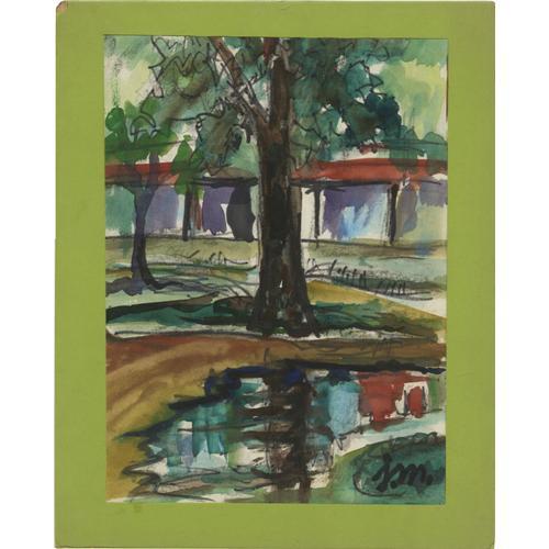 <B>JOSEPHINE MAHAFFEY (American, 1903-1982)</B></I><BR>Untitled Landscape<BR>Watercolor on paper, mounted on mat board<BR>Signed to lower right <I>JM</B></I><BR>13in. x 10.5in.<BR><BR>Josephine Mahaffey attended the College of Industrial Arts (now Texas Woman's University) and after graduation continued her studies with Sallie Blythe Mummert. Additional instruction was with Clinton King, Octavio Medellin, Kathleen Lawrence, and John Erickson. For many years she ran her own art gallery in Azle and taught watercolor classes in Fort Worth. Josephine was a fixture at Fair Park and the State Fair of Texas selling her art. In 1968, she was honored with the naming of 'Josephine Mahaffey Day" at the State Fair of Texas.<BR><BR> <B>Condition Report:</B> Normal signs of wear as appropriate with age.<BR><BR><b>Shipping:</b> Flat Material, Small (<a target="_blank" href="http://www.heritageauctions.com/common/shipping.php">view shipping information</a>)