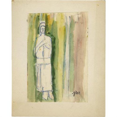 <B>JOSEPHINE MAHAFFEY (American, 1903-1982)</B></I><BR>Untitled Portrait<BR>Watercolor, ink, and graphite on paper, mounted on mat board<BR>10-1/4in. x 8-1/4in.<BR>Signed to lower right <I>JM</B></I><BR><BR>Josephine Mahaffey attended the College of Industrial Arts (now Texas Woman's University) and after graduation continued her studies with Sallie Blythe Mummert. Additional instruction was with Clinton King, Octavio Medellin, Kathleen Lawrence, and John Erickson. For many years she ran her own art gallery in Azle and taught watercolor classes in Fort Worth. Josephine was a fixture at Fair Park and the State Fair of Texas selling her art. In 1968, she was honored with the naming of "Josephine Mahaffey Day" at the State Fair of Texas.<BR><BR> <B>Condition Report:</B> Normal signs of wear as appropriate with age.<BR><BR><b>Shipping:</b> Requires 3rd Party Shipping (<a target="_blank" href="http://www.heritageauctions.com/common/shipping.php">view shipping information</a>)