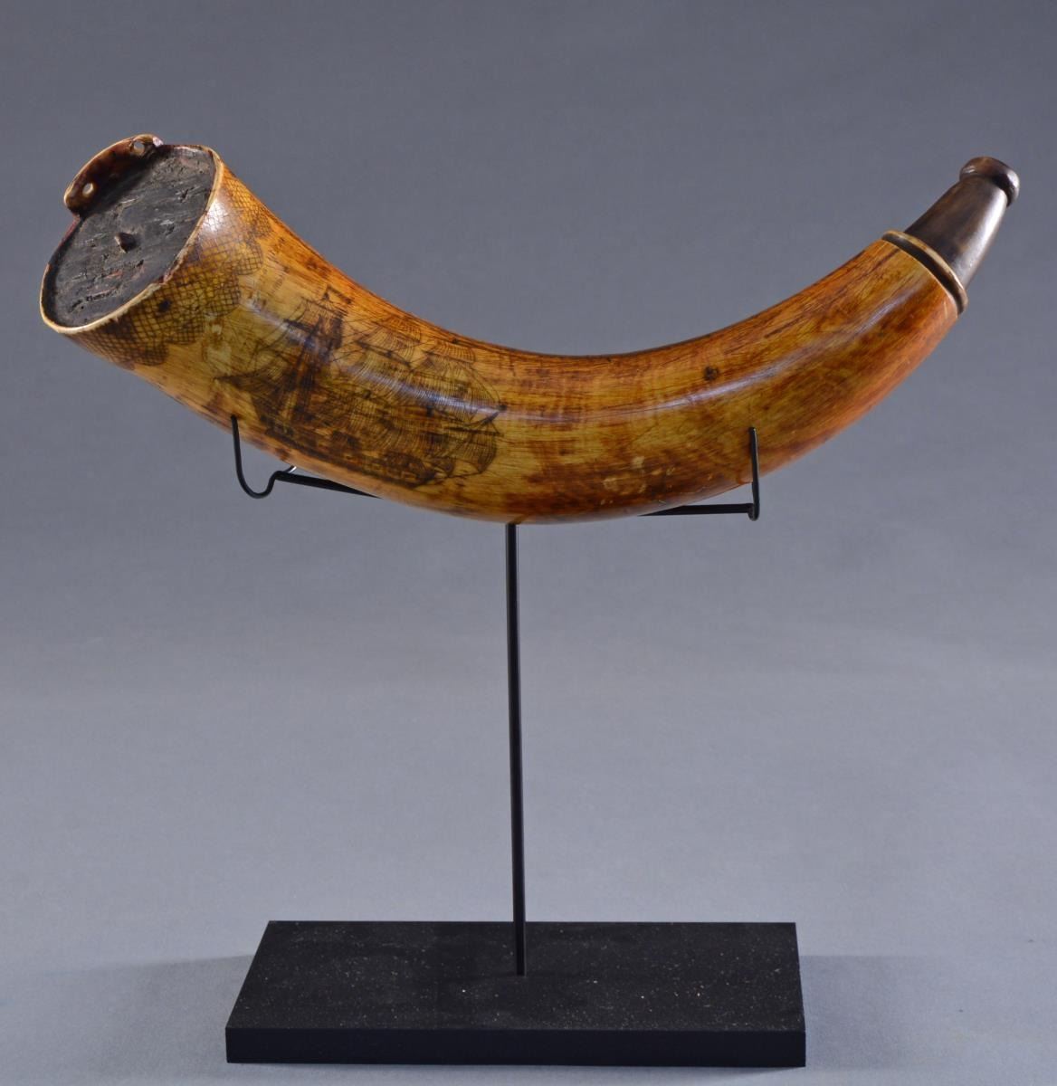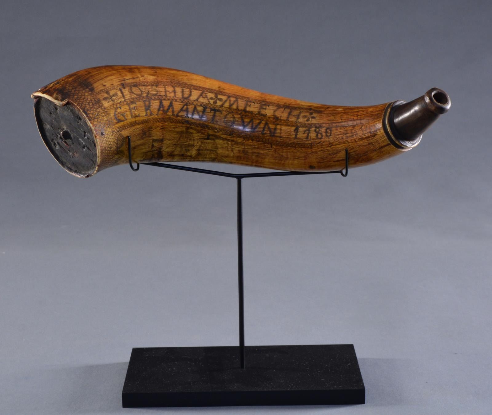 14" Horn, good honey patina, scrimshawed sailing ship below; JOSHUA MEECH / GERMANTOWN 1780” & “AYE READY”. CONDITION: very good overall, clear designs, retains lobed extension lanyard holes. PROVENANCE: From the Collection of John "Tim" Breth Jr. (02-13812/JS). $2,000-3,000.