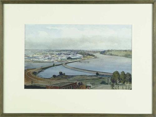 JOSIAH THOMAS TUBBY (American, 1875-1958) "OIL CITY FROM WESTERN PROMENADE PORTLAND, MAINE". Watercolor scene shows the oil and gas tanks lining Portland Harbor with other buildings and roads. Pencil inscription to back with artist and title, dated March, 1948. Housed in a simple stained wood frame with wide ivory matte. SIGHT SIZE: 10-1/2" x 17". CONDITION: Generally very good. 9-27214