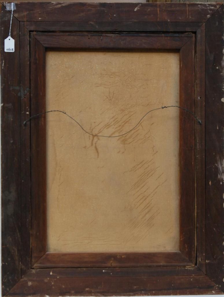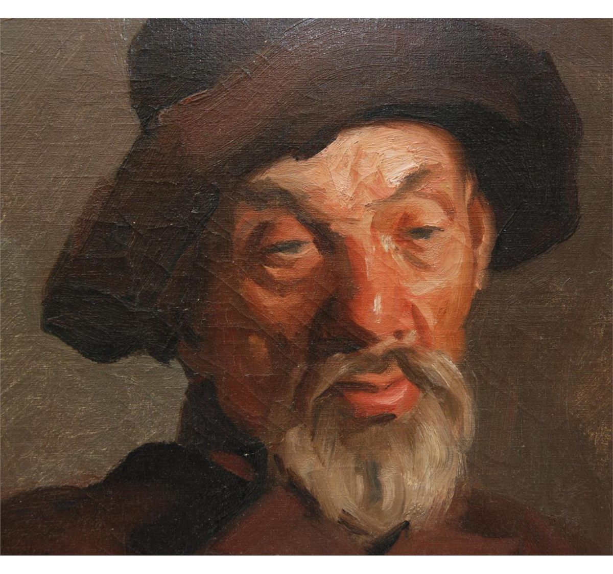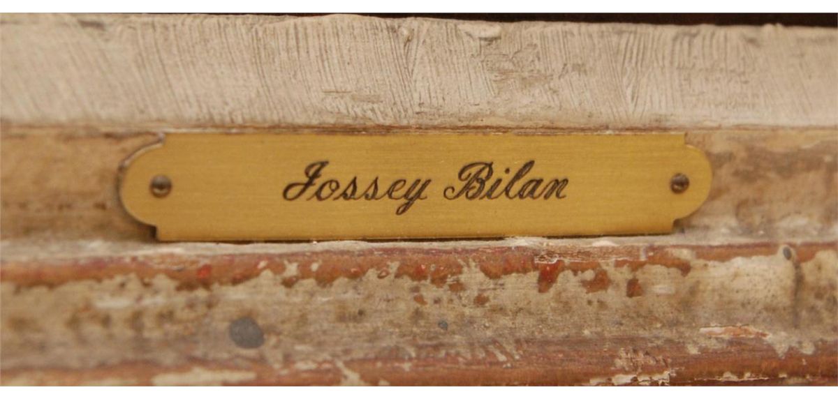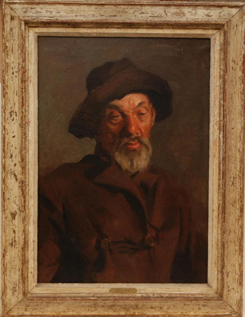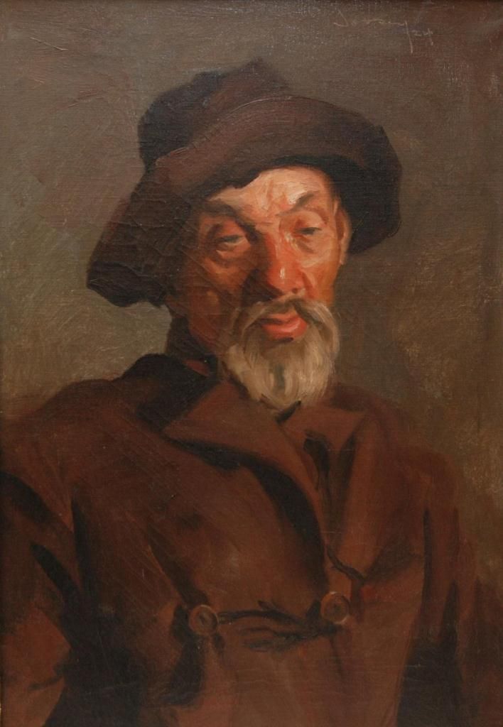19th century oil painting on canvas depicting the portrait of an old man wearing a coat and hat. Signed Jossey to upper right. Mounted in wooden frame with name plaque to lower center. Measures 26" height x 19" width + 3 1/2" frame (66cm x 48.2cm + 8.9cm). Provenance: Sam Feldman Collection.