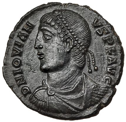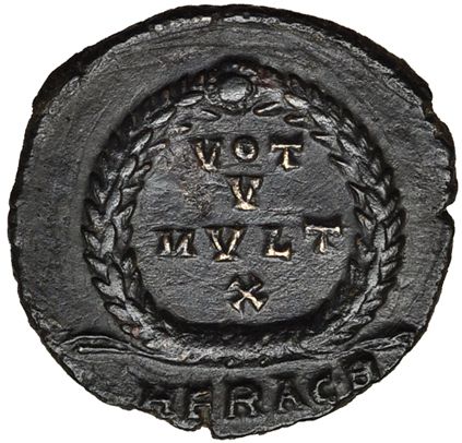 JOVIANO. Centenionalis (AE-3). Heraclea, b (363-364). R/ Dentro de corona de laurel ley.: VOT/V/MVLT/X. RIC-110. Pátina oscura. EBC-. Escasa.