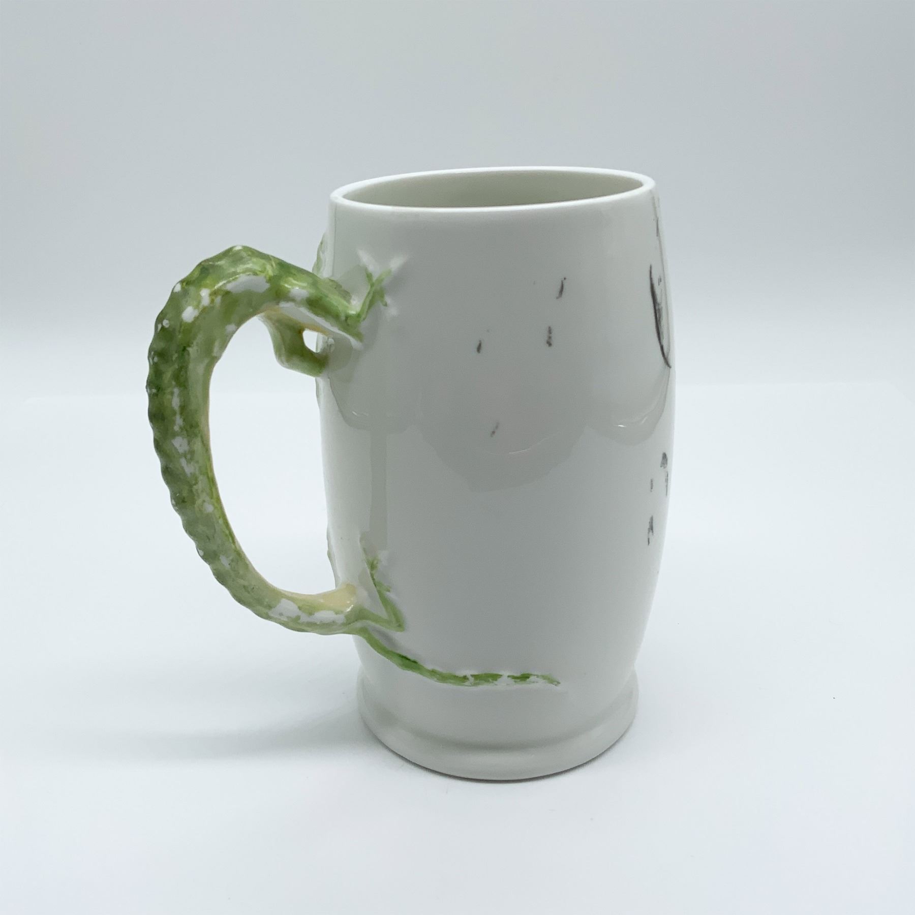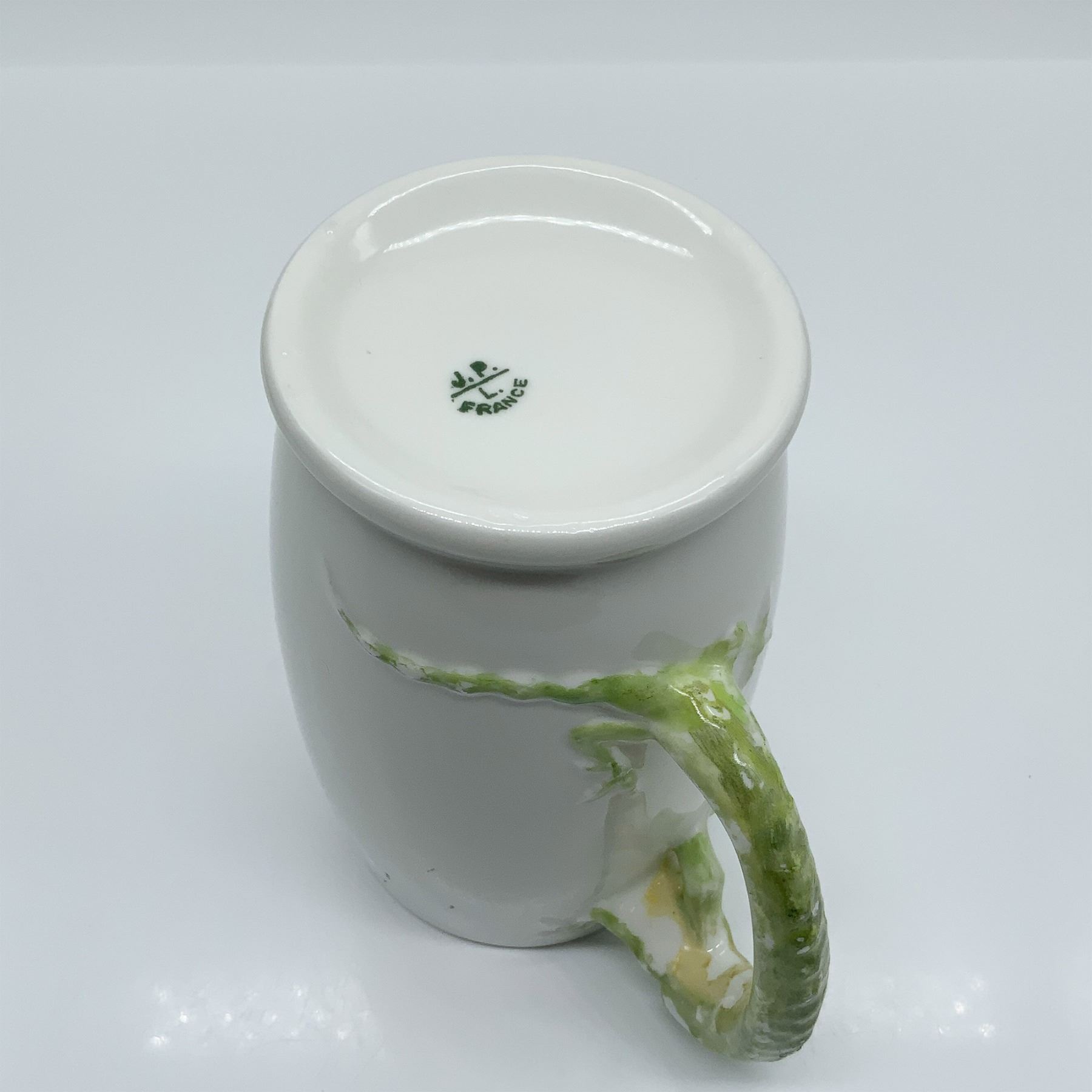Porcelain mug with a vibrant green dragon-shaped handle and delicate handpainted details. Marked "JPL France" on the underside, this 5.75-inch mug reflects the quality craftsmanship of Jean Pouyat Limoges. A charming and collectible piece.