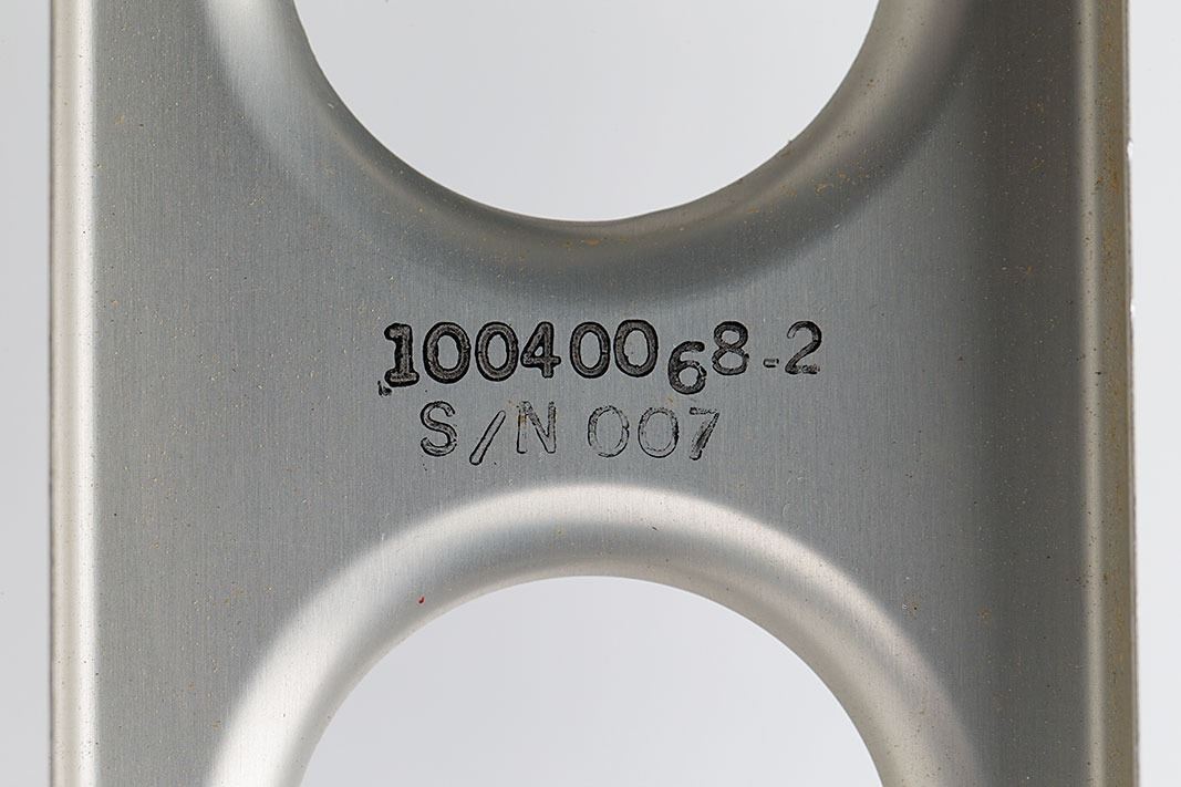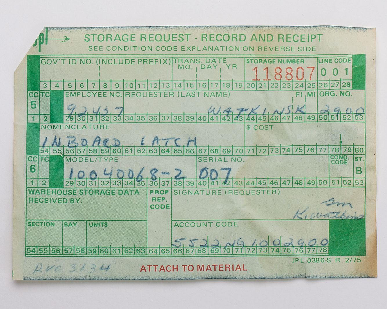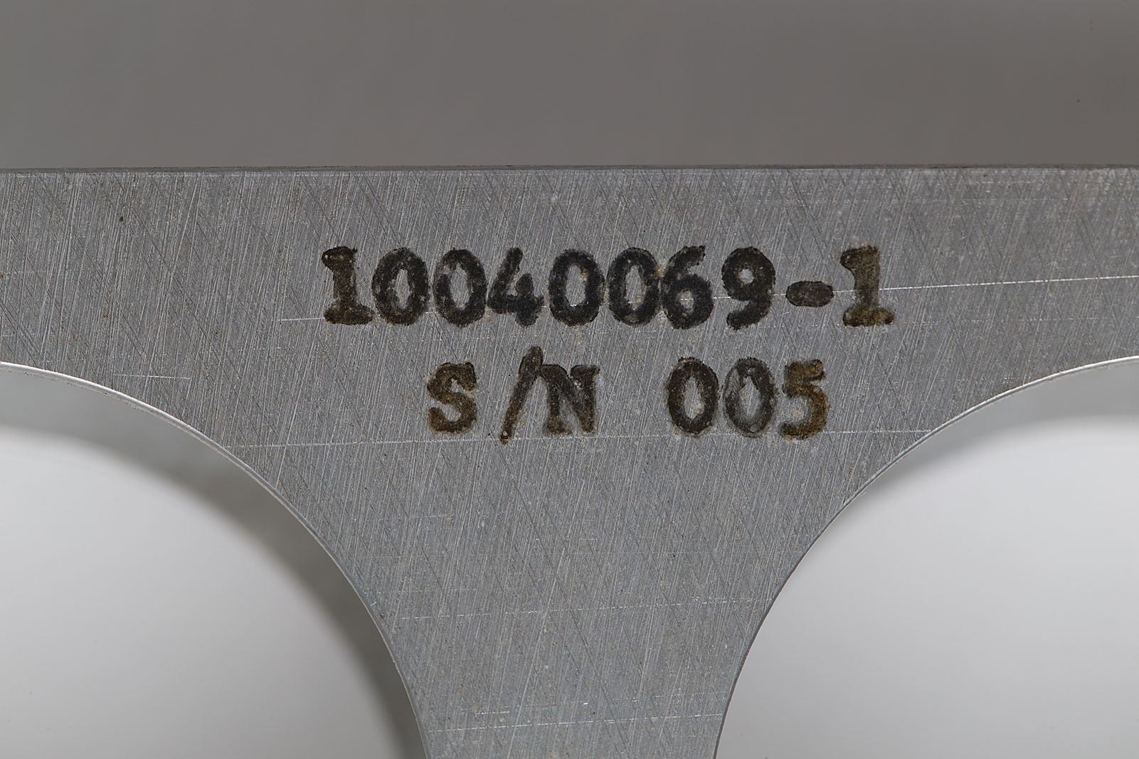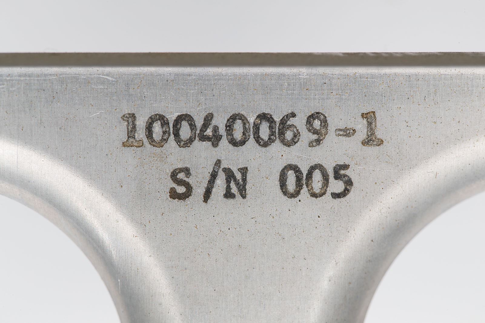 Two components for the Mars Viking Orbiter's solar arrays: one trapezoidal outboard hinge with a wired port for a motion sensor switch, measuring approximately 27? x 10.25? x 3?, marked on the underside, "10040069-1, S/N 005"; and one rectangular inboard latch, measuring 22? x 8.25? x 4.5?, marked on the underside, "10040068-2, S/N 007." In overall fine condition. Accompanied by an original JPL storage request receipt for the inboard latch, and by photocopied JPL inspection report paperwork related to the Viking's hinge and latch assemblies. Any Viking hardware is extremely rare, making this a great opportunity for collectors.