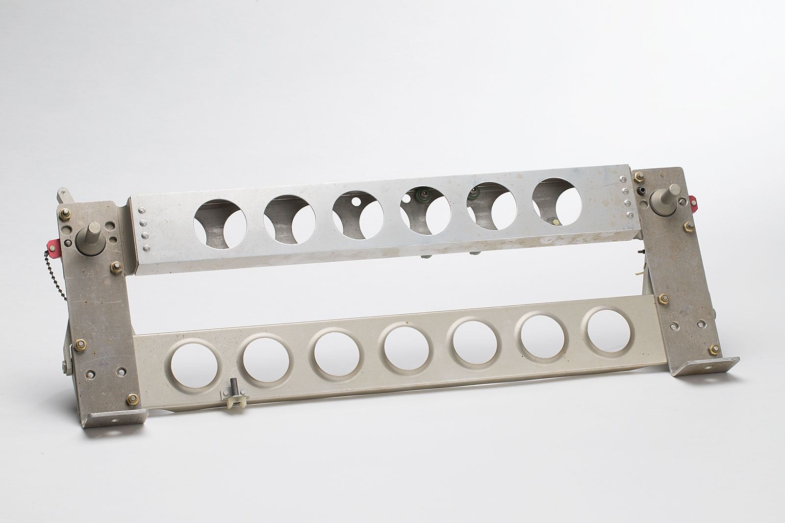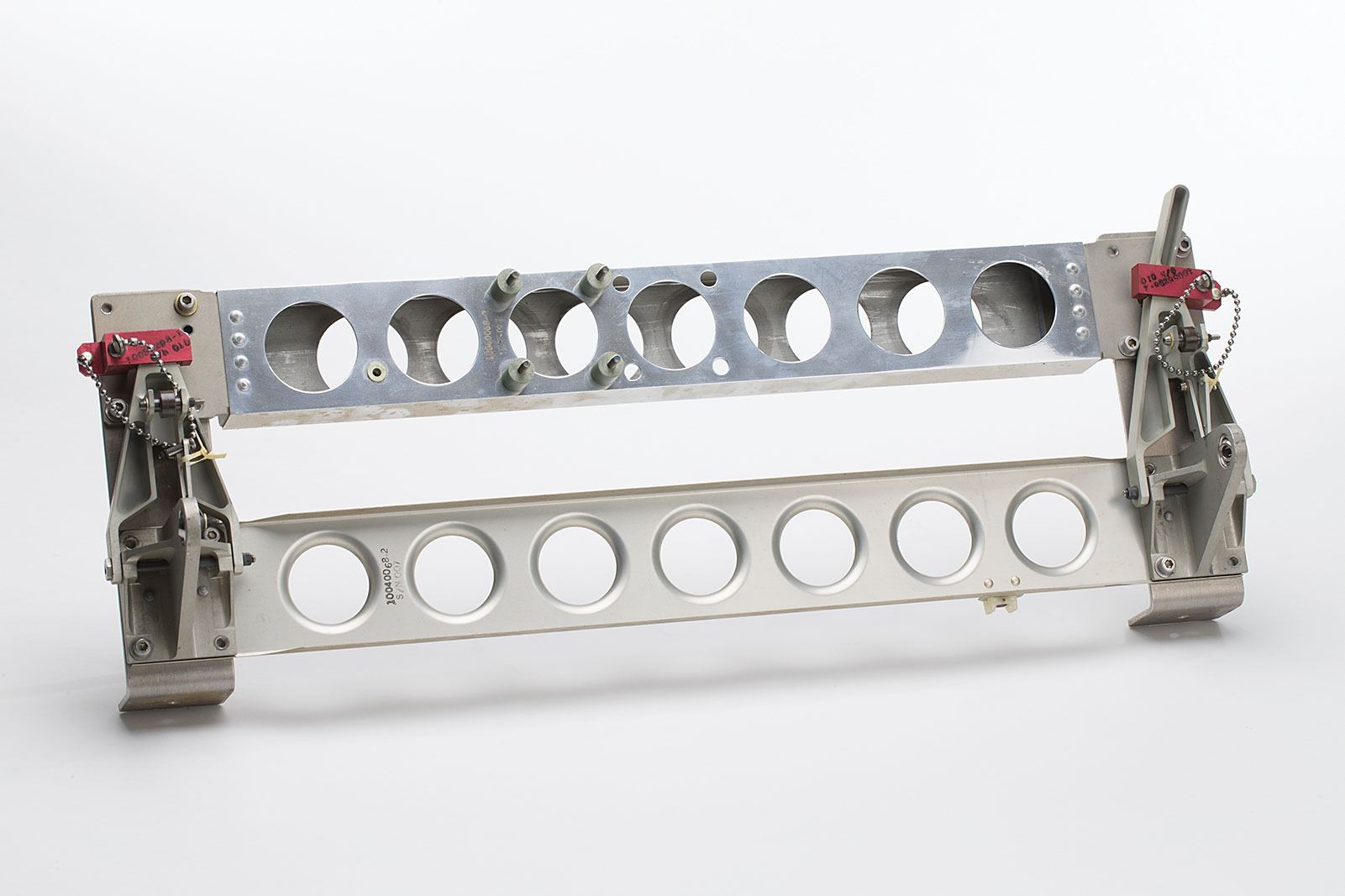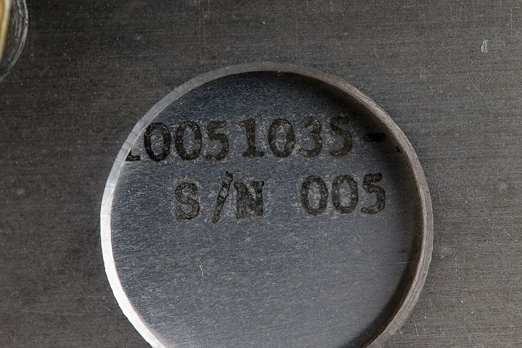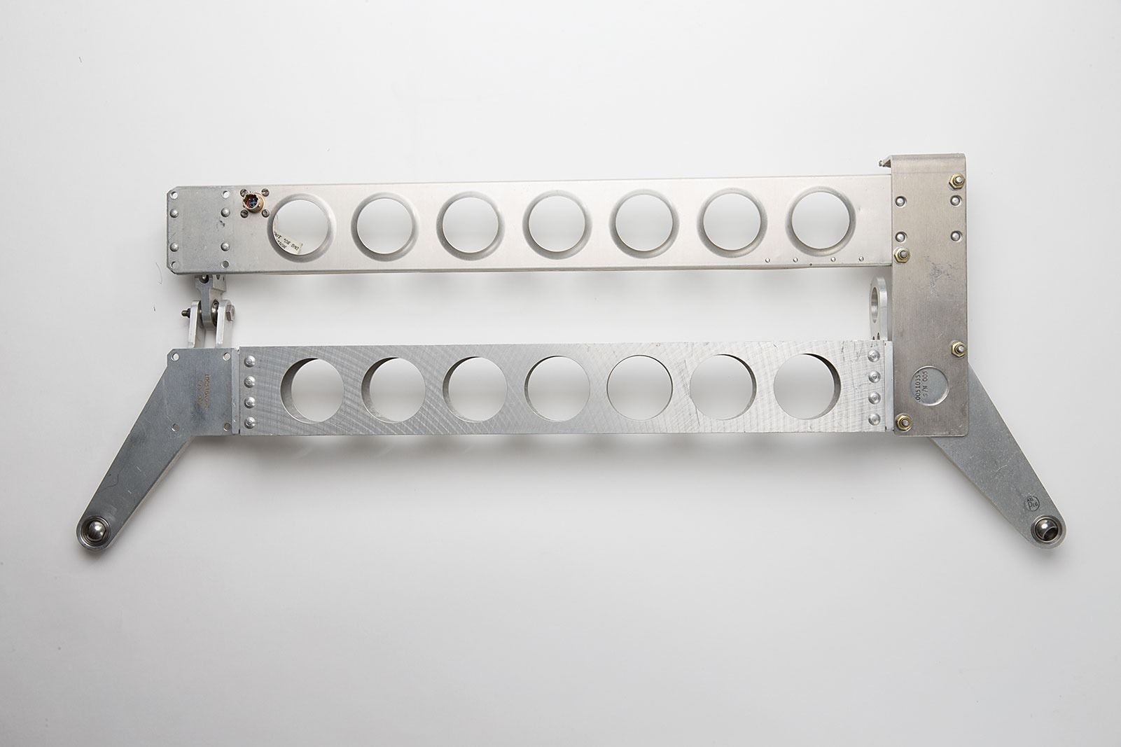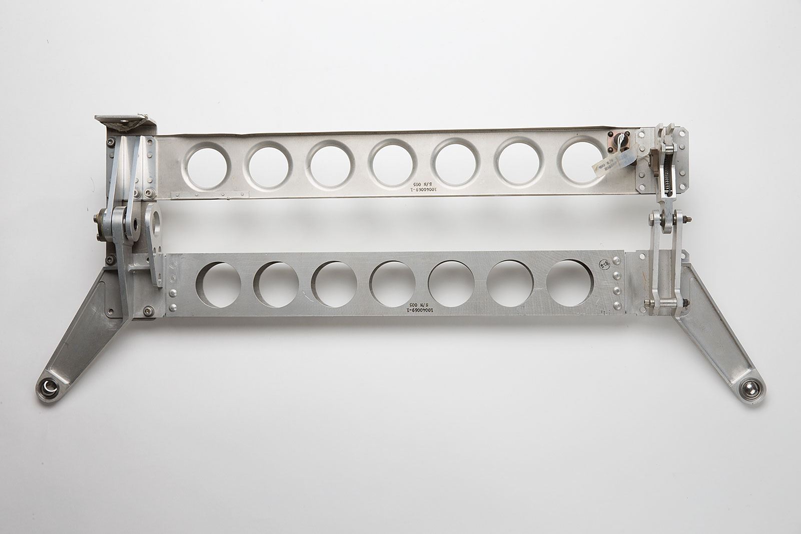 Two components for the Mars Viking Orbiter's solar arrays: one trapezoidal outboard hinge with a wired port for a motion sensor switch, measuring approximately 27? x 10.25? x 3?, marked on the underside, "10040069-1, S/N 005"; and one rectangular inboard latch, measuring 22? x 8.25? x 4.5?, marked on the underside, "10040068-2, S/N 007." In overall fine condition. Accompanied by an original JPL storage request receipt for the inboard latch, and by photocopied JPL inspection report paperwork related to the Viking's hinge and latch assemblies. Any Viking hardware is extremely rare, making this a great opportunity for collectors.