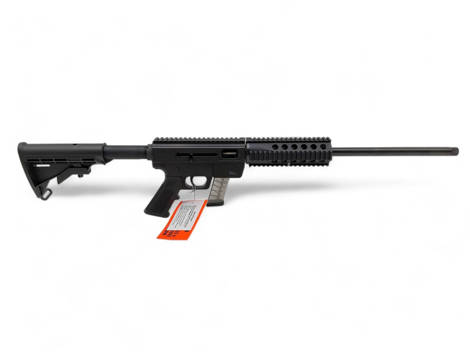 JR Carbine Semi Auto Rifle 9MM 18.6" Threaded Barrel Quad Rail Black, New. Includes one detachable magazine; adjustable rear stock. This is a non-restricted firearm.