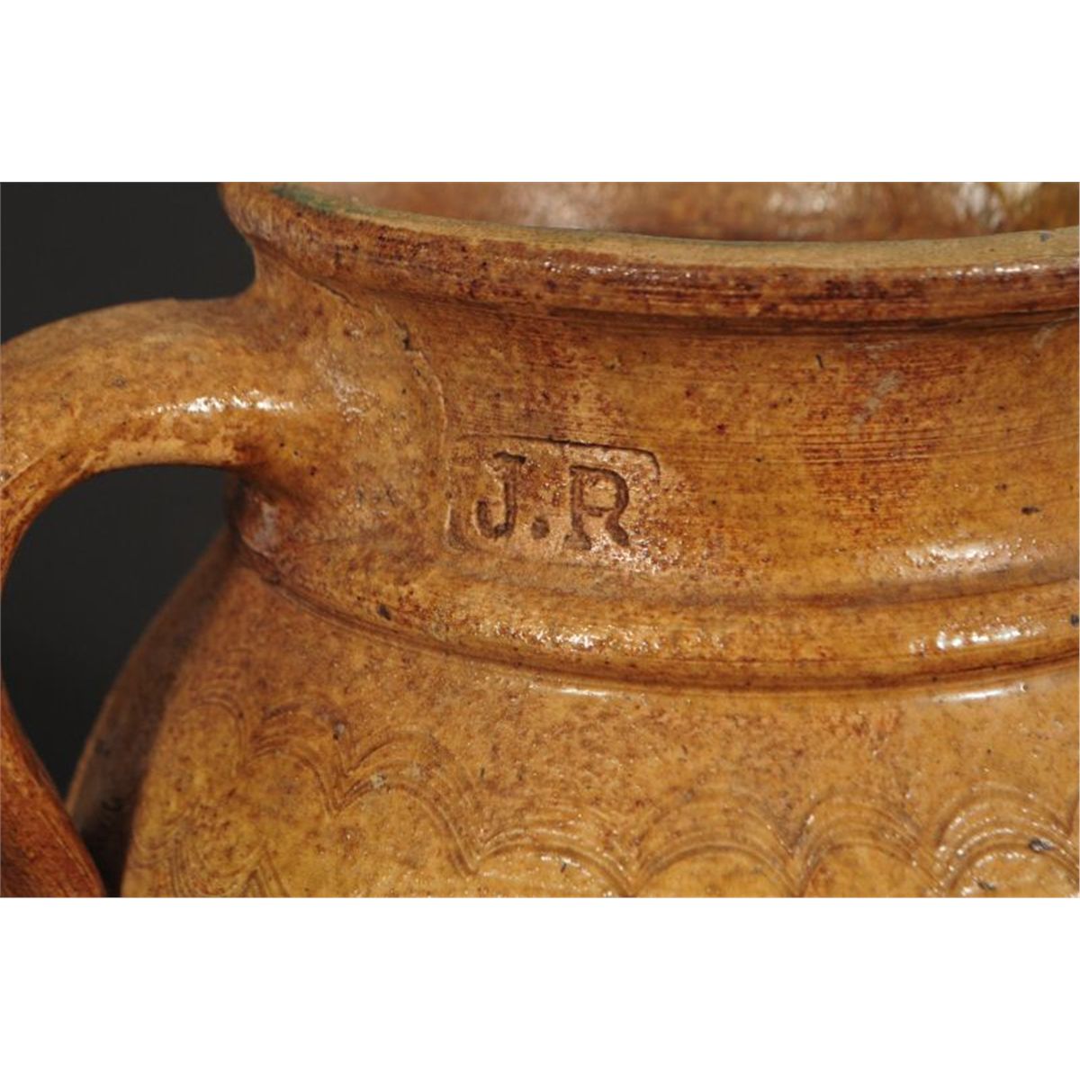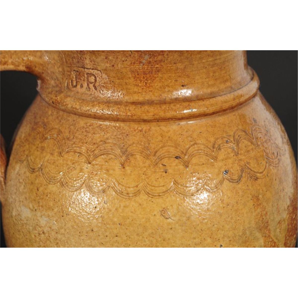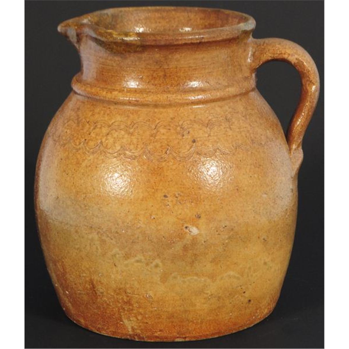 Originally part of the Georgeanna Greer Collection. Combed decorations. Rusk County, Texas. Signed JR. Has old repair to spout. Purchased at Harmer Rooke during the Georgeanna Greer Collection Auction in 1992. Illustrated in Greer's American Stoneware, page 156.