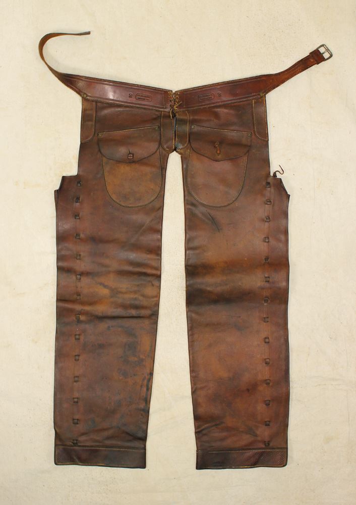 Extremely desirable early shotgun chaps that are nicely marked on both sides the straight waistband with the early Cheyenne mark. Very scarce and in crisp near mint condition. 39" in length.