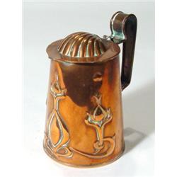 JS&S Art Nouveau copper tankard with hinged lid embossed with stylised flowers, marks to base, 14cm high