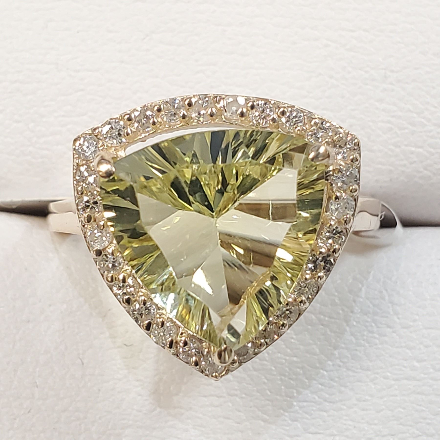 SIZE 6-3/4 - 10K YELLOW GOLD LEMON QUARTZ (4CT) DIAMOND (0.27CT,I1-I3,G-I) 27 SIDE DIAMOND RING (RING IS RESIZABLE FOR $40) (~WEIGHT 4.39G), MADE IN CANADA, APPRAISED RETAIL $1400