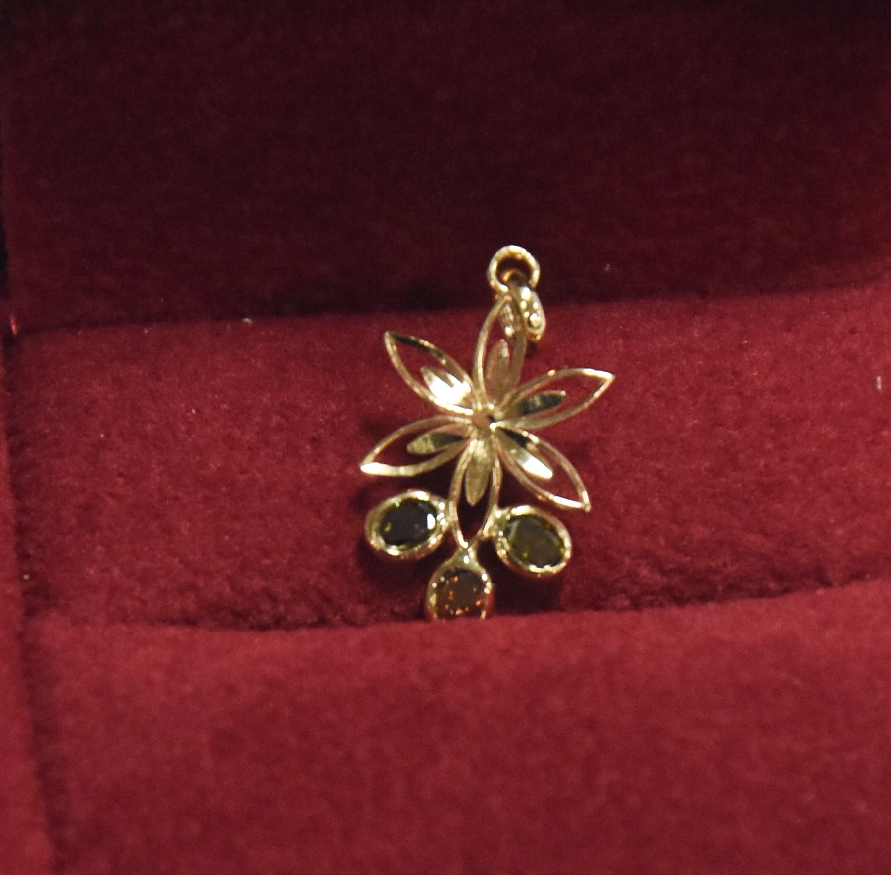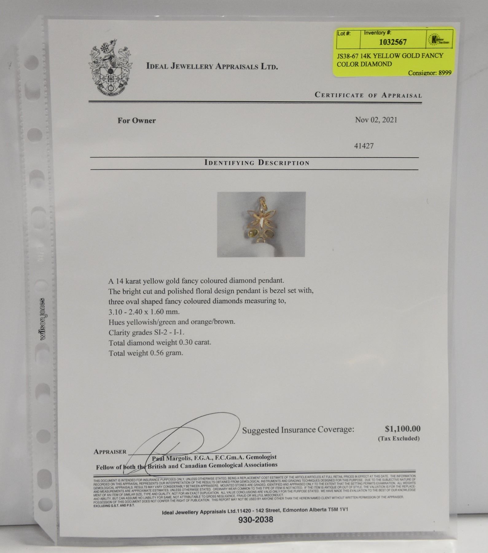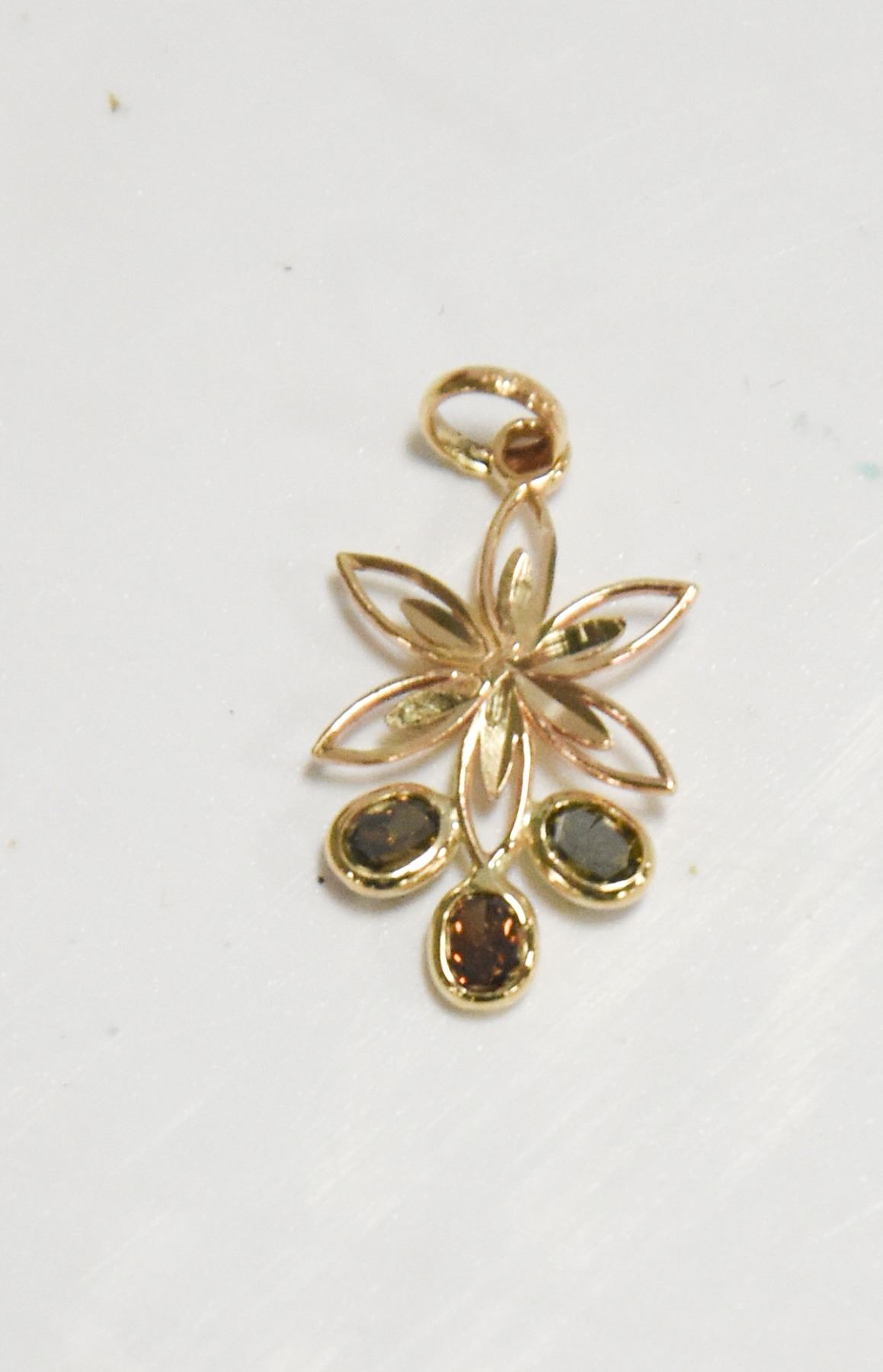 PENDANT. POLISHED FLORAL DESIGN, 3 OVAL SHAPED DIAMONDS. 3.10-2.40 X 1.60MM HUES YELLOW/GREEN AND ORANGE/BROWN. CLARITY GRADES SI-2 AND I-1. DIAMOND WEIGHT 0.30 CARATS. SUGGESTED RETAIL VALUE $1100.00