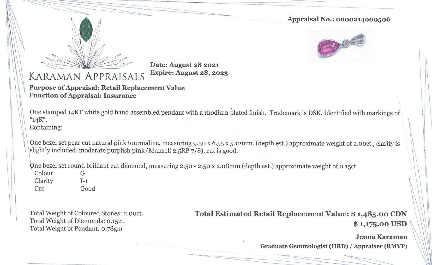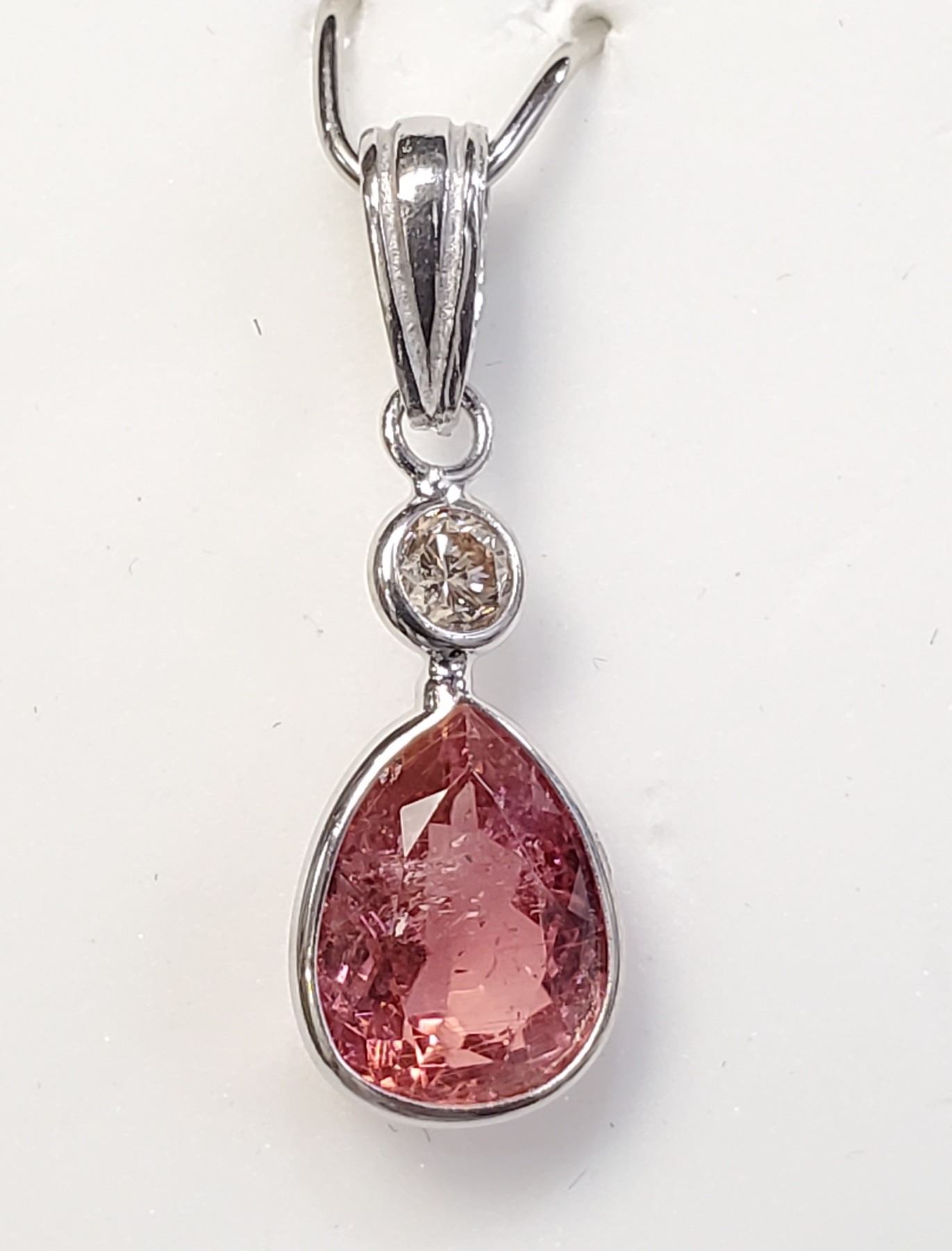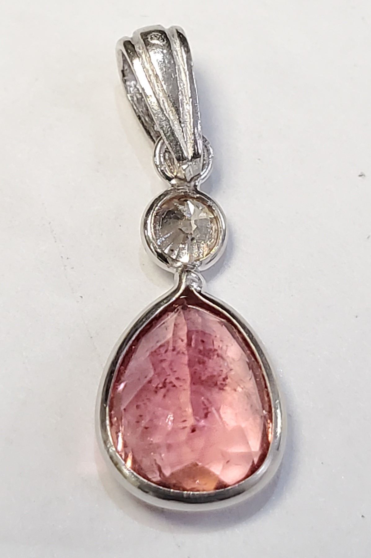 PENDANT. 14K WHITE GOLD PINK TOURMALINE(2CT) DIAMOND(0.15CT,I1,G) PEAR SHAPED PENDANT (~WEIGHT 0.78G), APPRAISED RETAIL $1485