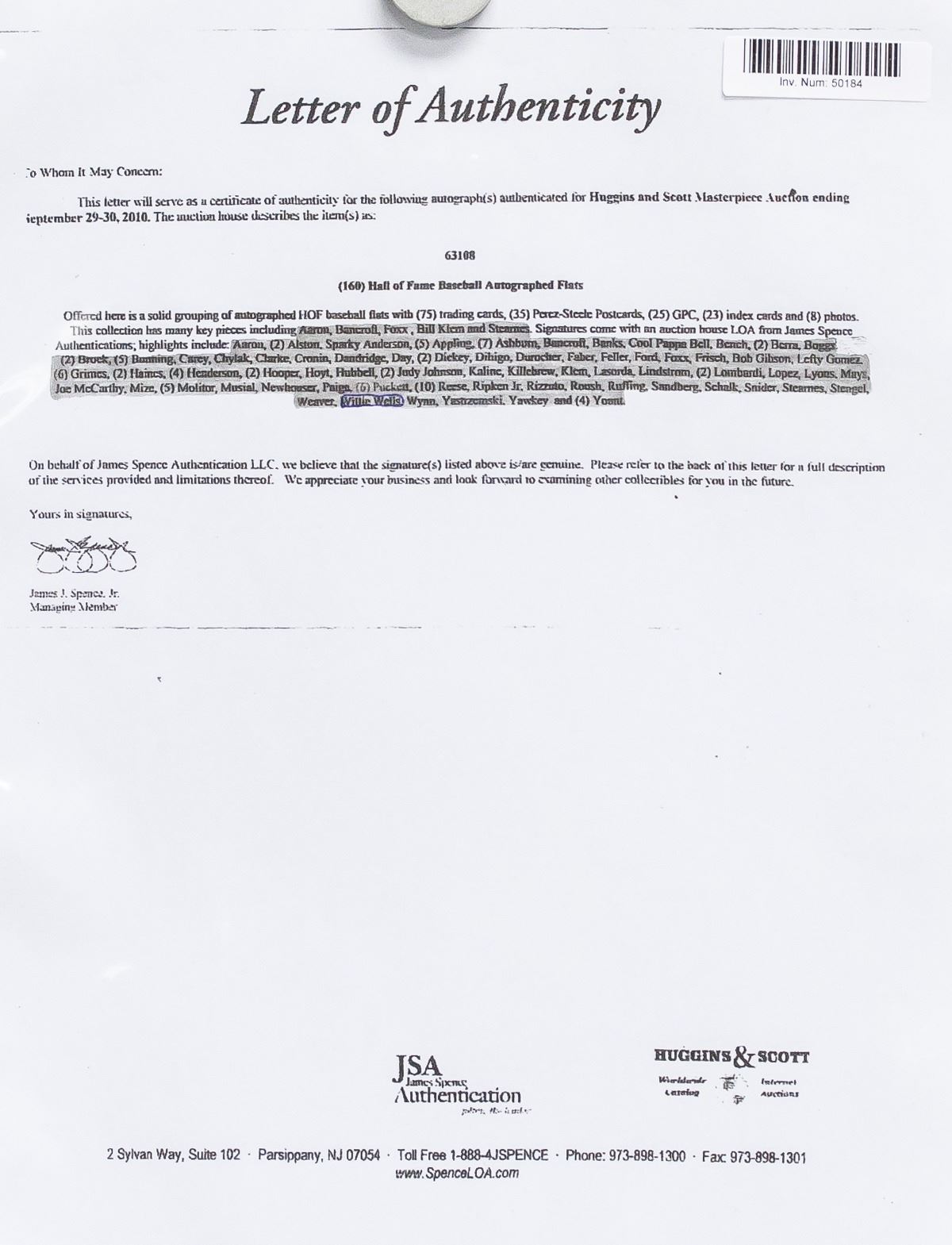 e) All descriptions appearing on-line are subject to any variation announced by the auctioneer, on-line or otherwise, prior to the time of sale. No representation is made in respect to any copyrights available to any purchaser. All prospective purchasers shall have an opportunity to inspect all lots prior to the time of the auction and it is recommended that they do so. Purchasers assume all risks by failing to inspect and/or have items and/or lots properly authenticated prior to purchase. Nothing within this contract shall limit the purchaser's recourse against an expert retained by them to determine authenticity. We are an auction house and/or small collectibles store only, and are unable to, and do not, guarantee the authenticity of any items listed for sale, or the condition of same, whether at auction or retail.