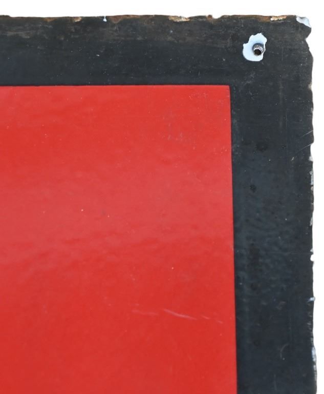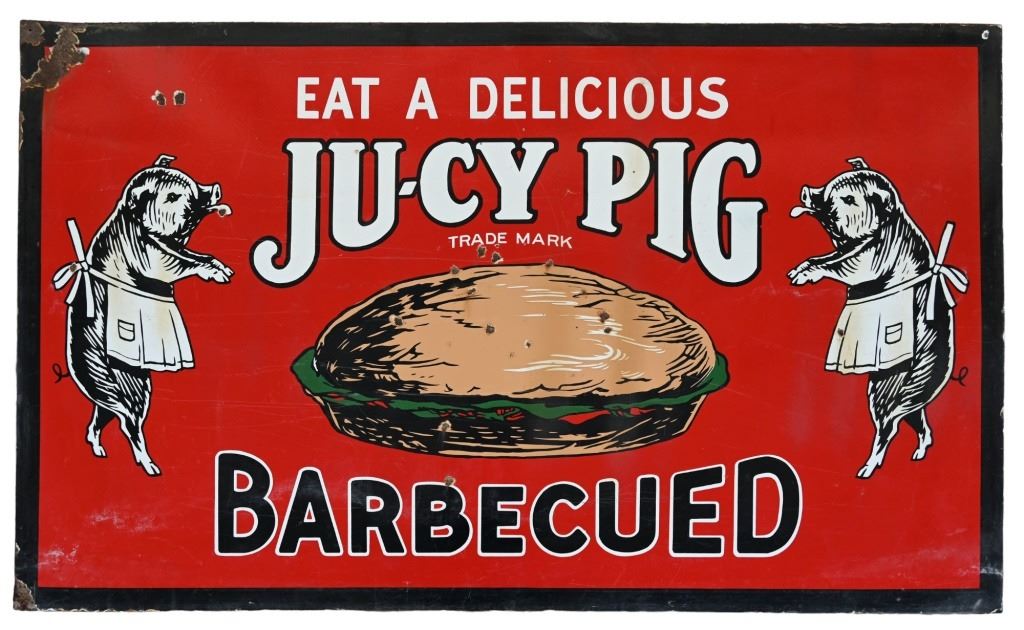 "Eat A Delicious Ju-cy Pig Barbecued" single sided porcelain sign measures 60" x 36".
