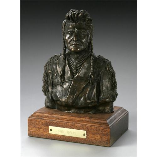<B>JUAN DELL (American 1933 - )</B></I><BR><I>Chief Joseph</B></I><BR>Bronze on wood pedestal (Fenn bronze)<BR>7 x 5.5 x 3.5in.<BR>Numbered: 14/30<BR>Signed and numbered to reverse<BR>Foundry mark to reverse<BR>1 Items <BR><BR><B>Condition Report:</B> In original condition