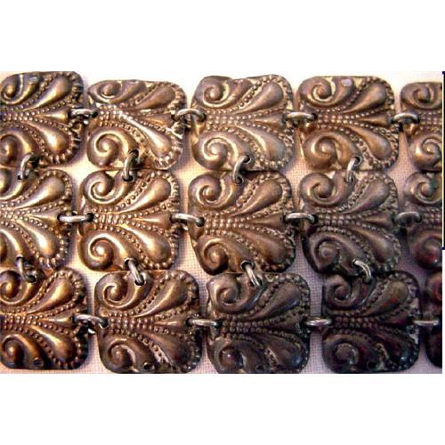 Antique genuine silver Ateret L'Talit / decorative strip for Tallis. Origin unknown but possibly German, 19th century.<BR>Measures 25X 2inches.<BR>Consists of linked repousse silver rectangles. Abstract scrolling raised decoration on each.<BR>Two links have come undone, but the rest is in excellent condition. While there are apparently no hallmarks, the silver was tested to be genuine.