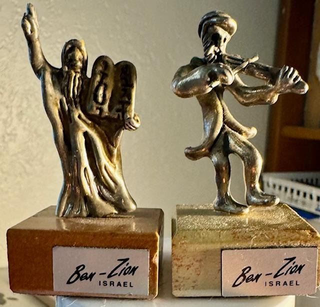 A lot of 2 vintage sterling silver sculptures by Ben Zion, Israel representing 'Moses and the 10 Commandments' and 'The Fiddler'. The sizes are 3"x1 1/2"x1 1/2" and are mounted on stone bases with Ben Zion label.Each item is marked Sterling or 925 on the backside. Collectible Judaica, Home Decor And Silverware.