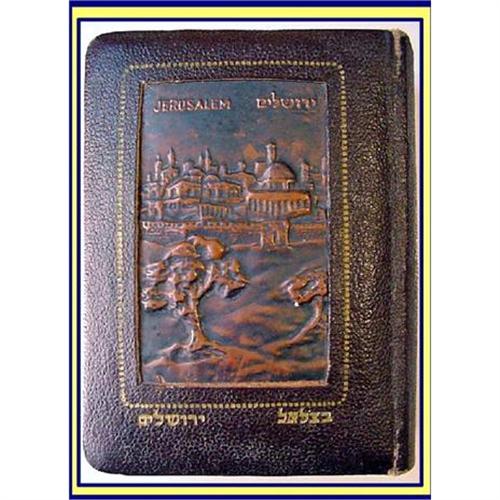 Judaica, signed Bezalel prayer book / Sidur with copper plaque and leather cover. Jerusalem, early 20th century.<BR>Measures 4 3/4inches long and a little over 3 1/2inches wide. 1 1/4inch thick.<BR>Copper plaque depicting the City of David from the hill opposite, set into the leather cover of a Sidur with gold lettering Jerusalem and Bezalel in Hebrew.<BR>Inside is the Daily Prayer Book with a "new translation" by Joseph Guns. Published by Sinai and printed in PALESTINE.<BR>Condition is very good. No rips/tears.