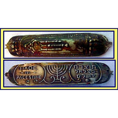 A Mezzuzah case in silver made in Palestine pre 1948 Israel, Bezalel, Jerusalem.<BR>Measures 2 5/8inches long.<BR>Was laquered/varnished, but this has almost entirely worn off.<BR>Besides traditional letters on the front, the back has a large Menorah between English and Hebrew marks: Made in Palestine with a Star of David and Totzeret Bezalel Yerushalayim with a Magen David.<BR>Condition is good.