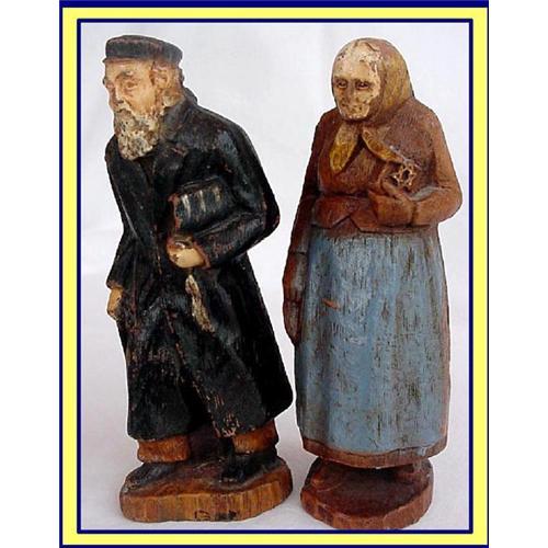 Pair of very old East European Jewish figurines, made Russia/Poland/other East European country, probably early 20th century.<BR>The man is a little over 5 1/2inches high.<BR>First appearance look like wood carved figures, but closer inspection reveals that they are made of some kind of ceramic material and polychrome cold painted.<BR>Each stands on a naturalistic looking 'wooden base'. The old man leans on a stick, his tfillin bag under one arm and his tzitzit hanging out from his buttoned up coat. Long white beard and skull cap as worn by the old Ashkenazi Jews. His wife, in headscarf, carries a prayer book with a carved Magen David on the cover.<BR>No identifying marks.<BR>Good original condition. Original paint with natural losses and back of woman figure's base has a chip.