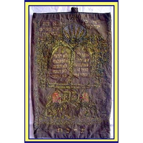 Torah Cover, dating from pre State of Israel, Palestine, very early 20th century. Hand embroidered.<BR>Measures 26inches long.<BR>Embroidered with the traditional lions, luchot habrit, Crown, Kaf Taf (Keter Torah), inscriptions and flowers. Star of David on top. Most unusual in that it is all brown. The fabric is simple cotton - clearly hinting at tough times, when even a Torah Cover, decorated with such obvious love and effort, was made without the luxury of velvet and silk. <BR>Another unusual feature of this cover is that there is only one strap, attached in the middle of the cover. <BR>There is some ageing to the fabric, in the form of golden spots. <BR>Embroidered date Taf Resh Nun Chet has lost part of the first two letters and there are some other spots where the embroidery is lost. Otherwise, the cover is in good condition with no rips/tears.