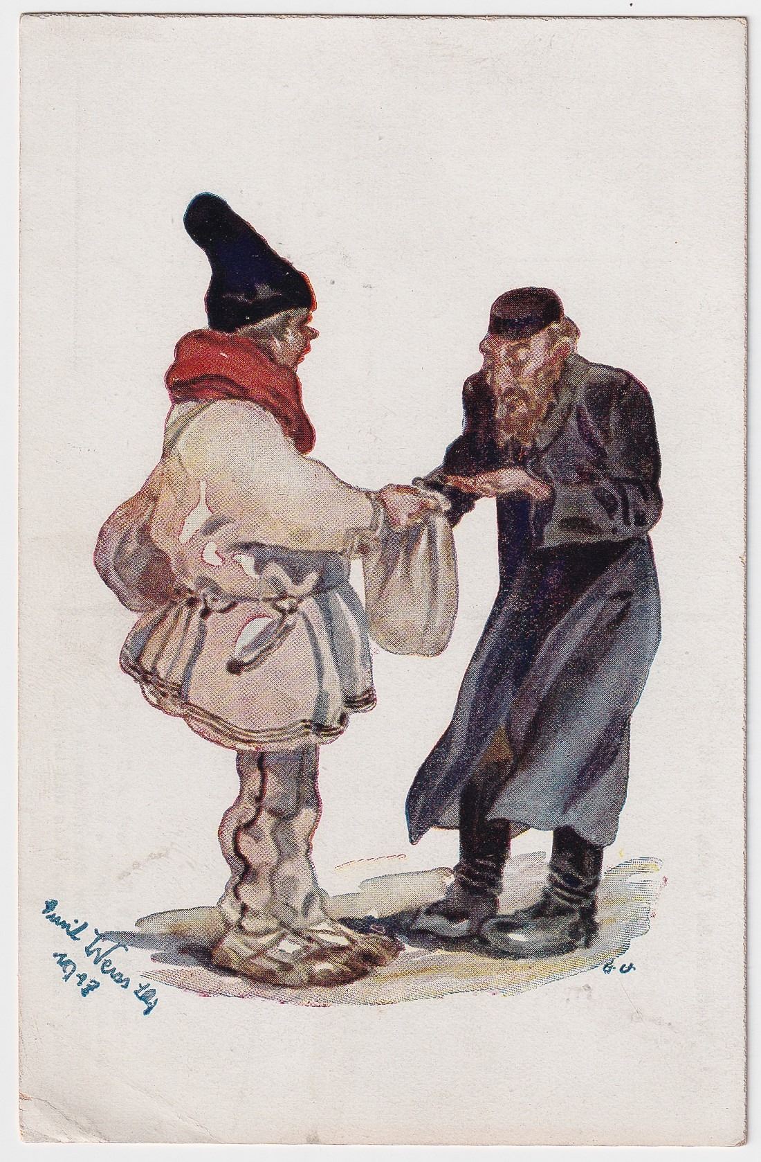 Lot of two turn of the century postcards from France and Germany, showing caricatures of Jewish people. Not postally used, 3.5 x 5.5 inches. German postcard is titled, 'Wolhynische Typen', ca. 1917. Very good.