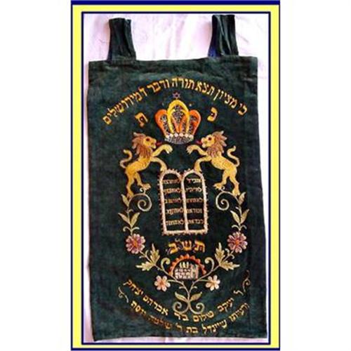 Hand embroidered Torah mantle from Palestine, pre 1940. <BR>The cover measures 26 inches long and the straps add another 4 1/2 inches.<BR>Deep forst green velvet on which the Lions of Judah besides the Luchot Ha Brit (Tablets with 10 Commandments) and beneath which is the Crown of G-d, a Star of David above it. Hebrew embroidered prayer for opening the Holy Ark and Kaf Taf (Keter Torah). The date Taf Shin Bet is embroidred underneath with a view of the Western wall Kotel HaMaaravi, favorate Bezalel symbol. Garlands of flowers support the lions and a dedication to family members is embroidered on the bottom. <BR>Workmanship is quite lovely with very fine sewing and beautiful, design. <BR>Condition is wonderful. This piece was treasured in a Judaica collection for many years.