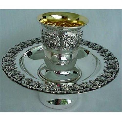 Sterling Silver Mayim Acharonim - traditional symbolic handwashing set. <P><P> Measurements: 4 1/2" high; diam of bowl is 5". <P><P> Bowl stands on round foot with cylindrical neck. Flaring sides end in a traditional pattern of raised grapes and vineleaves. This pattern and shape are echoed in the accompanying goblet. The goblet is gilt washed. Marks: both pieces are marked Hazorfim 925 <P><P> Condition: mint