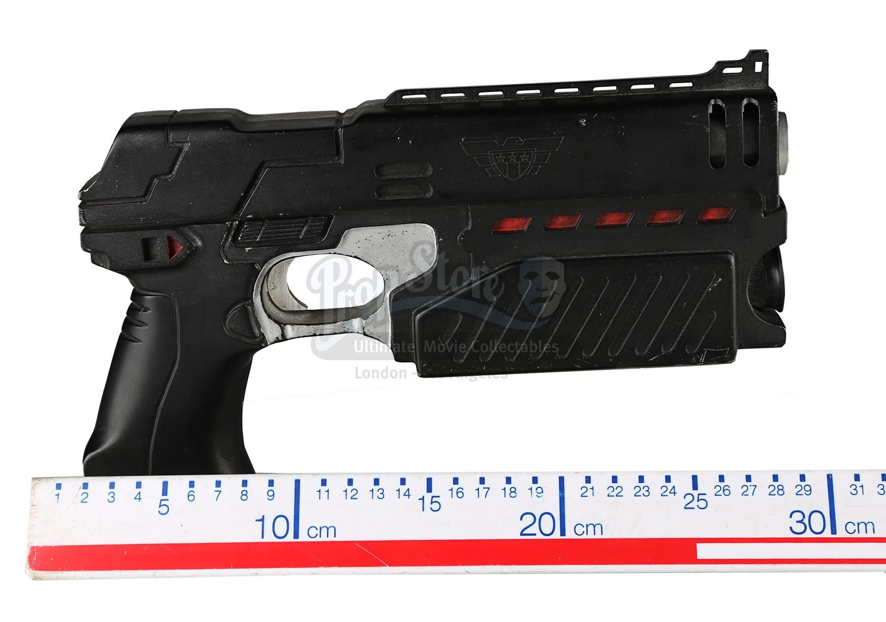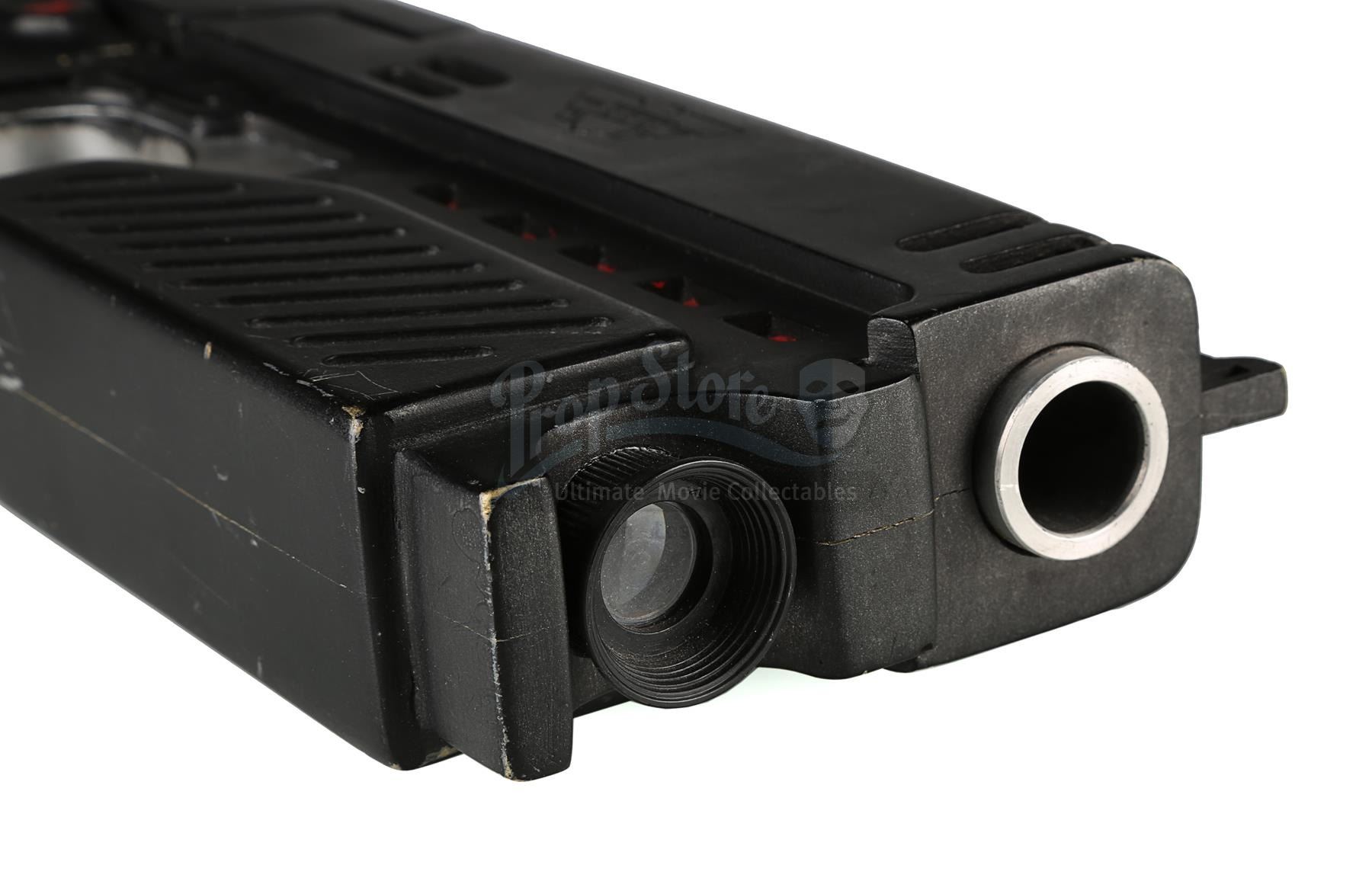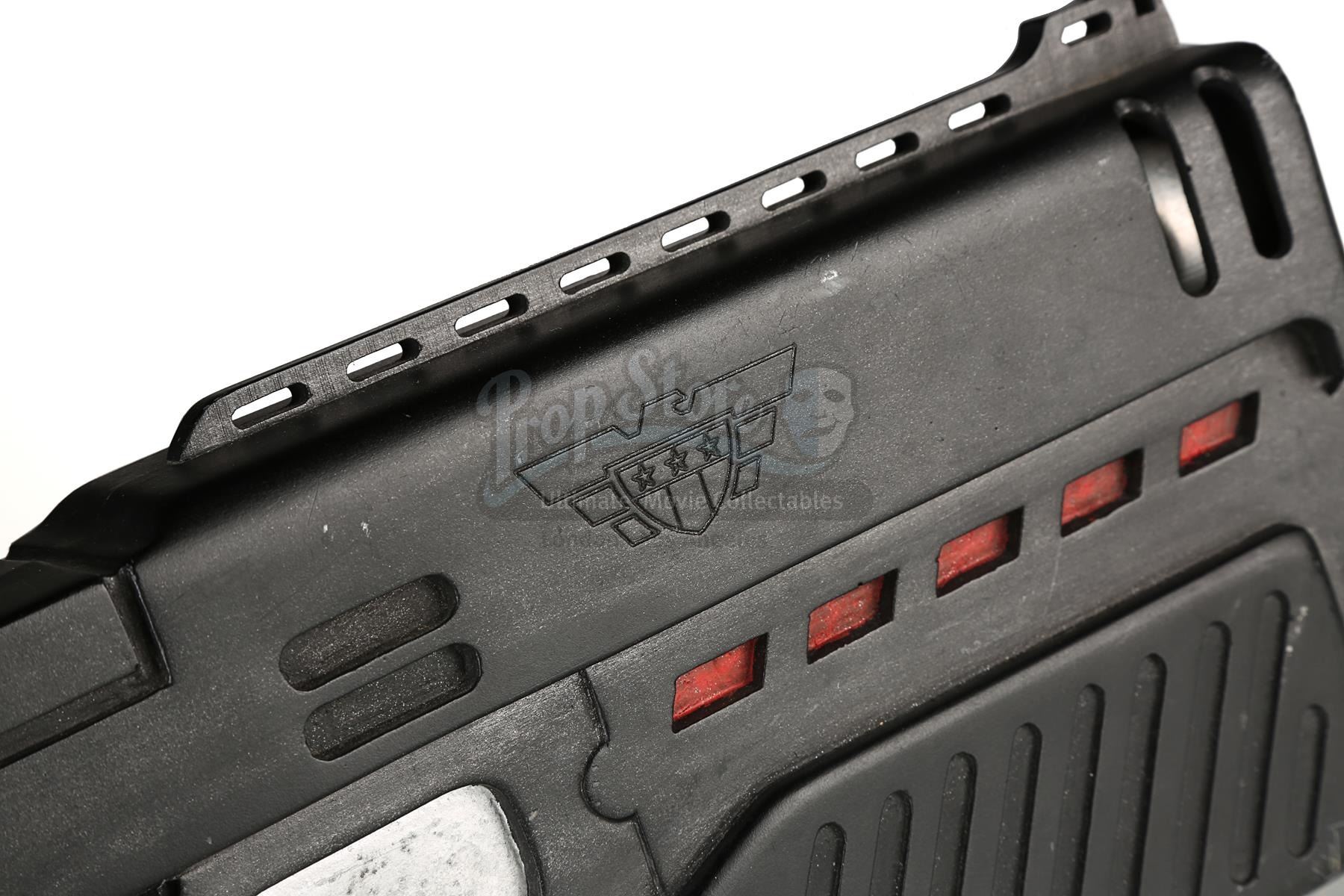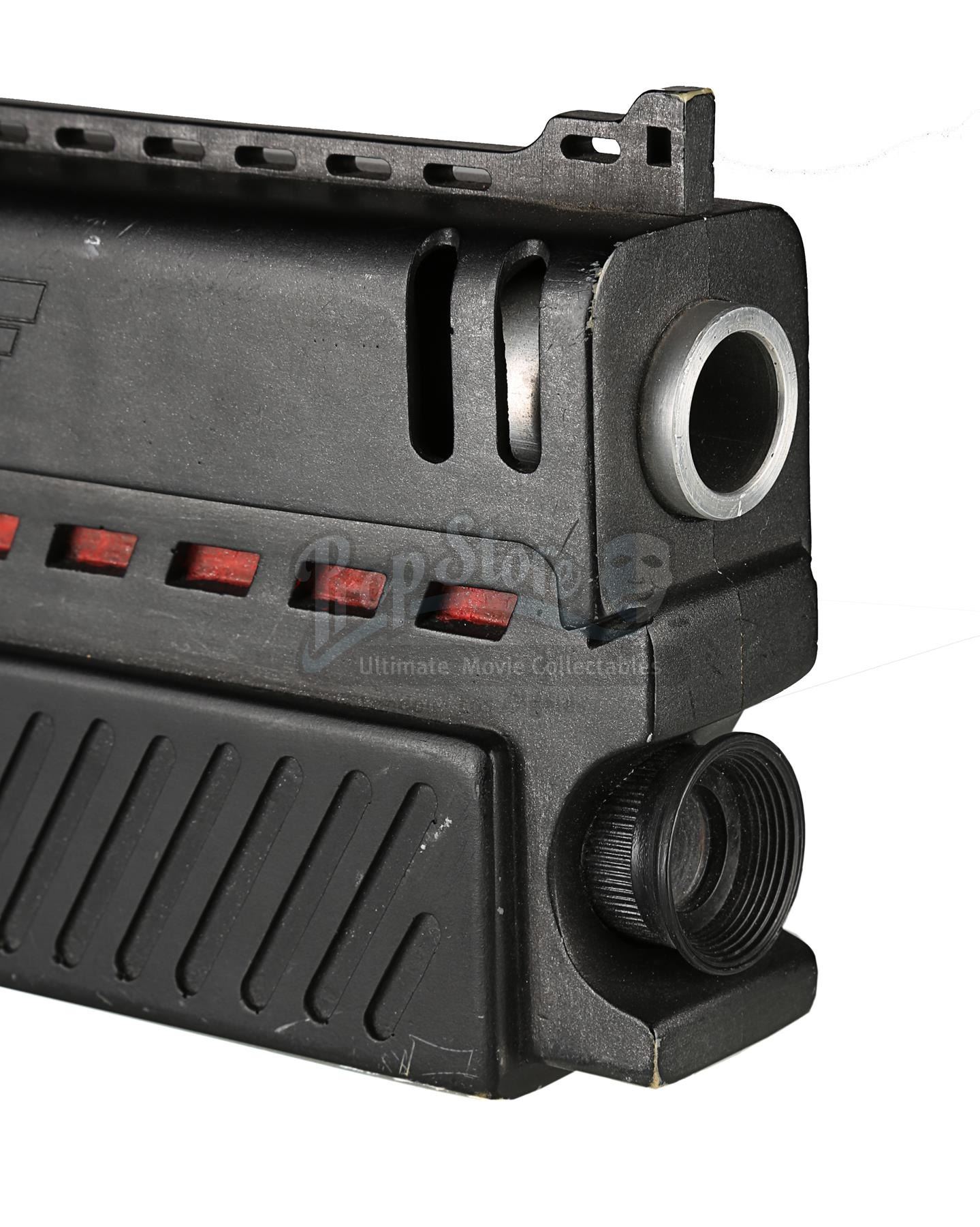 Used for scenes in which hero, live-firing Lawgivers were not required, the stunt Lawgiver is made of resin with a turned aluminium barrel. Vented detailing runs along the top and sides, with a secondary barrel below. The light panels running along the sides of the futuristic firearm have been finished in metallic red paint, with faux-silver paint on the magazine, grip and trigger housing. Displaying some scratches and minor chips on the resin, the Lawgiver remains in good condition.