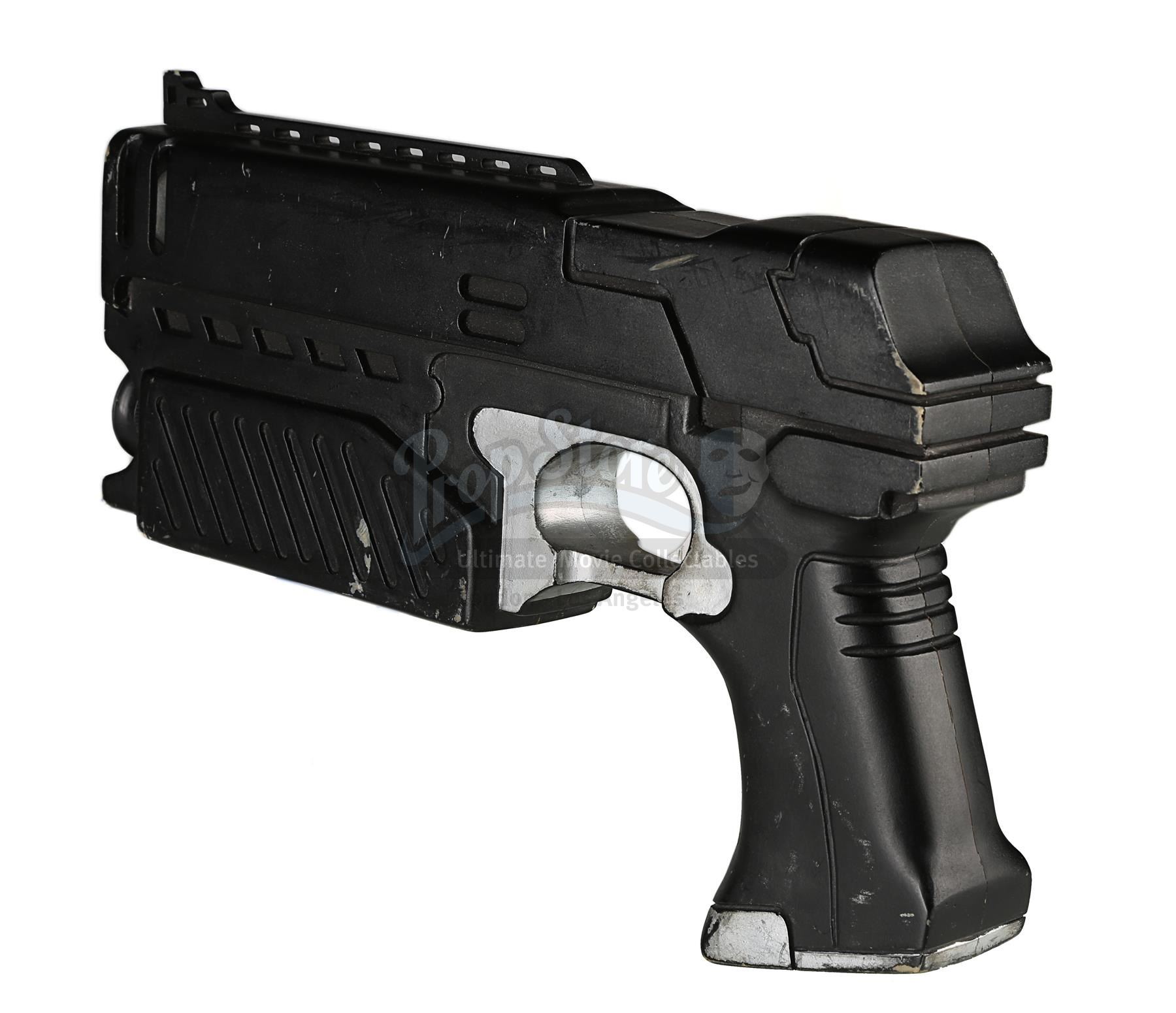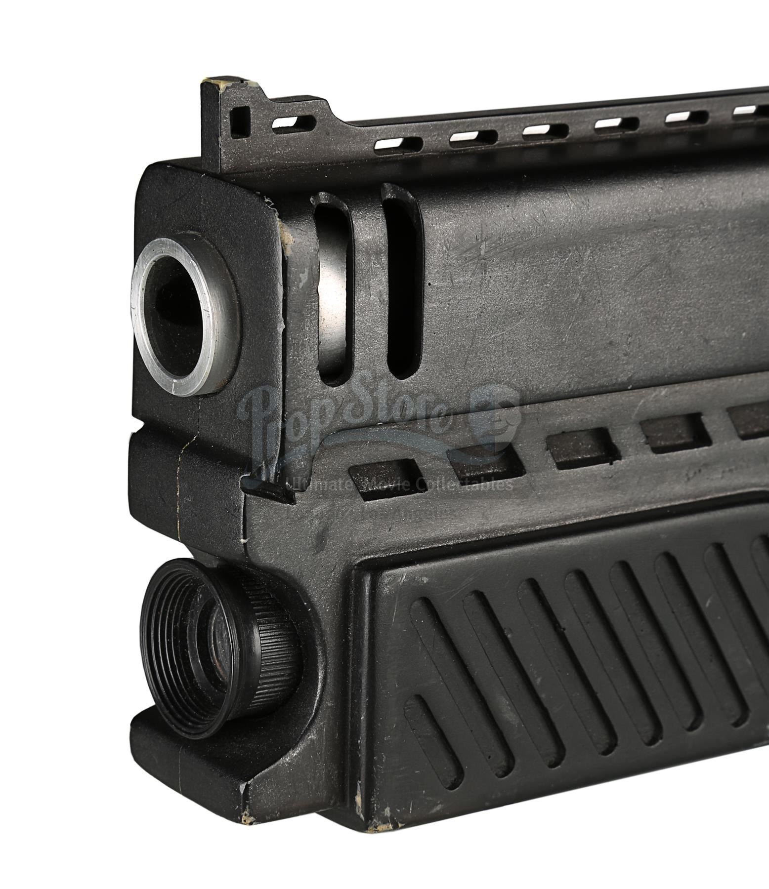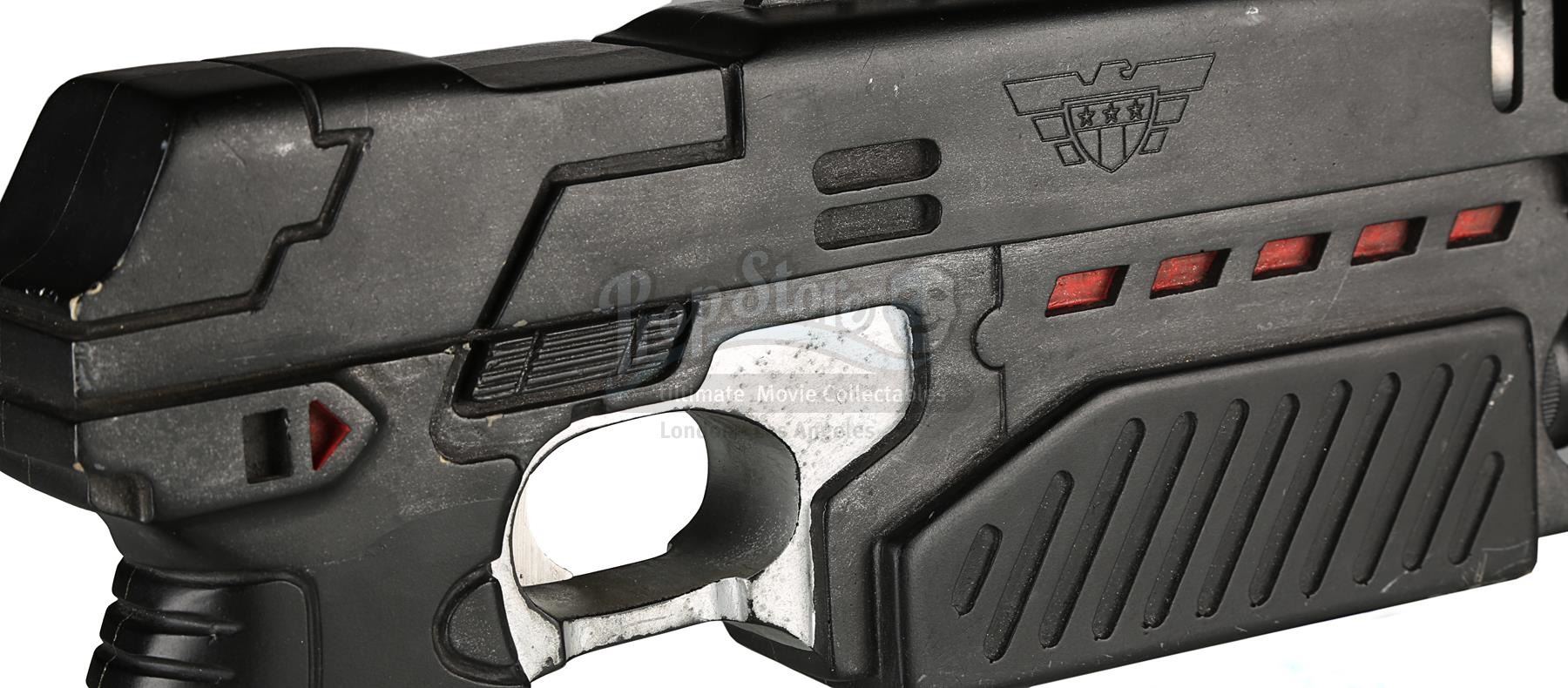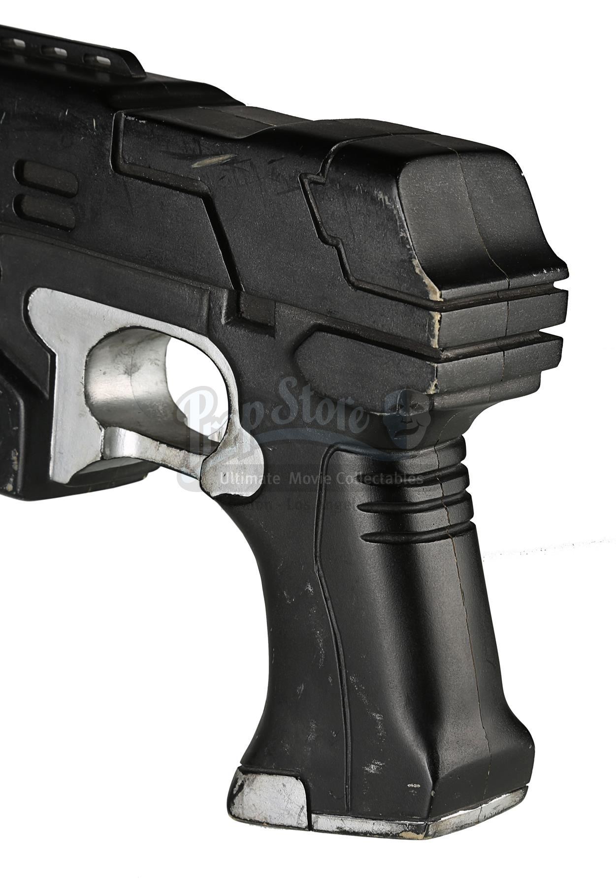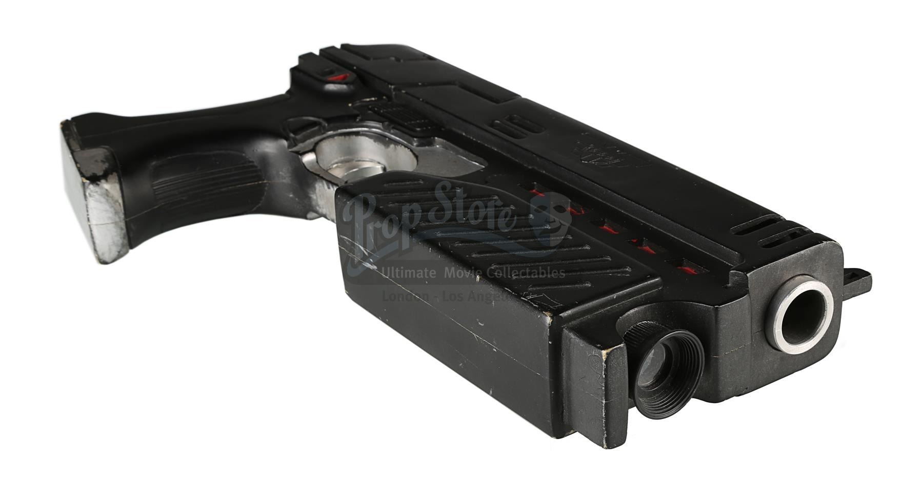 Used for scenes in which hero, live-firing Lawgivers were not required, the stunt Lawgiver is made of resin with a turned aluminium barrel. Vented detailing runs along the top and sides, with a secondary barrel below. The light panels running along the sides of the futuristic firearm have been finished in metallic red paint, with faux-silver paint on the magazine, grip and trigger housing. Displaying some scratches and minor chips on the resin, the Lawgiver remains in good condition.