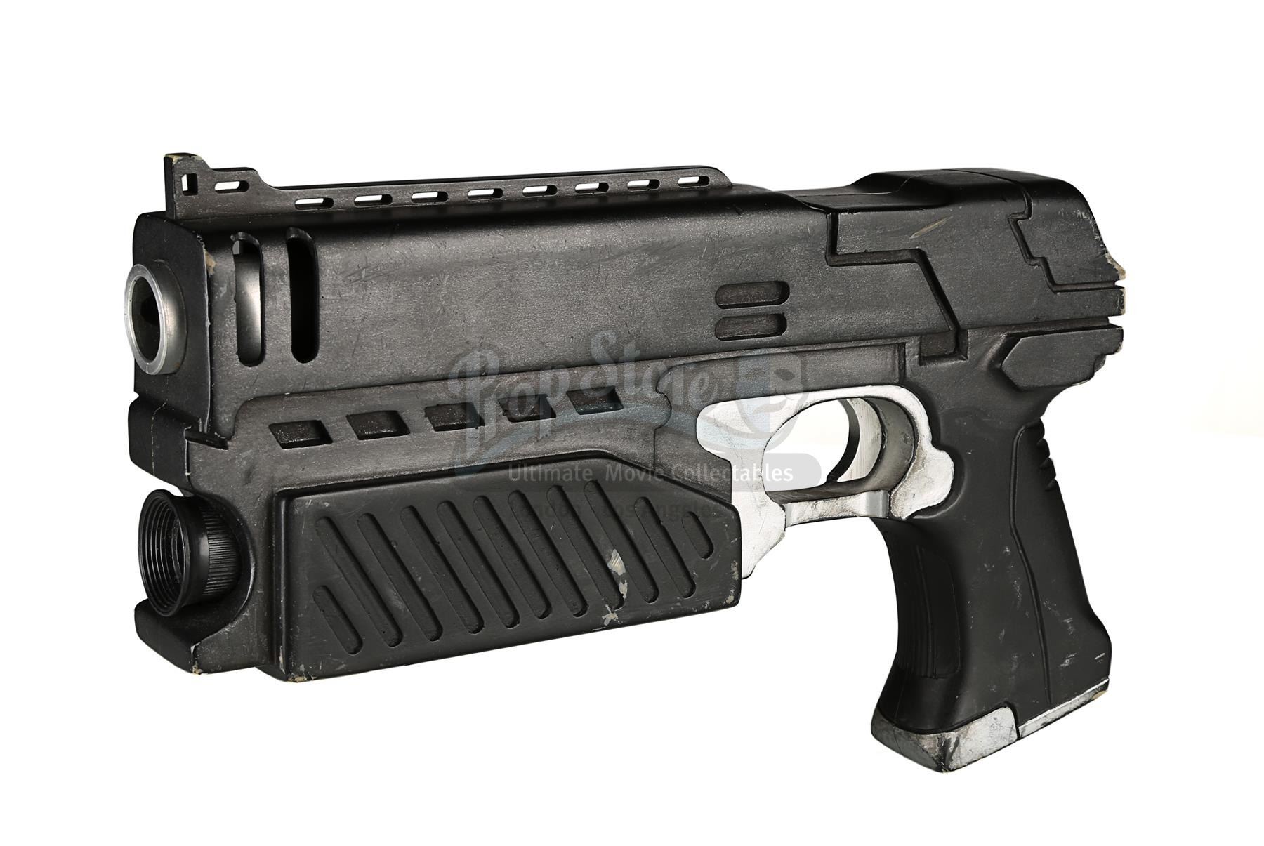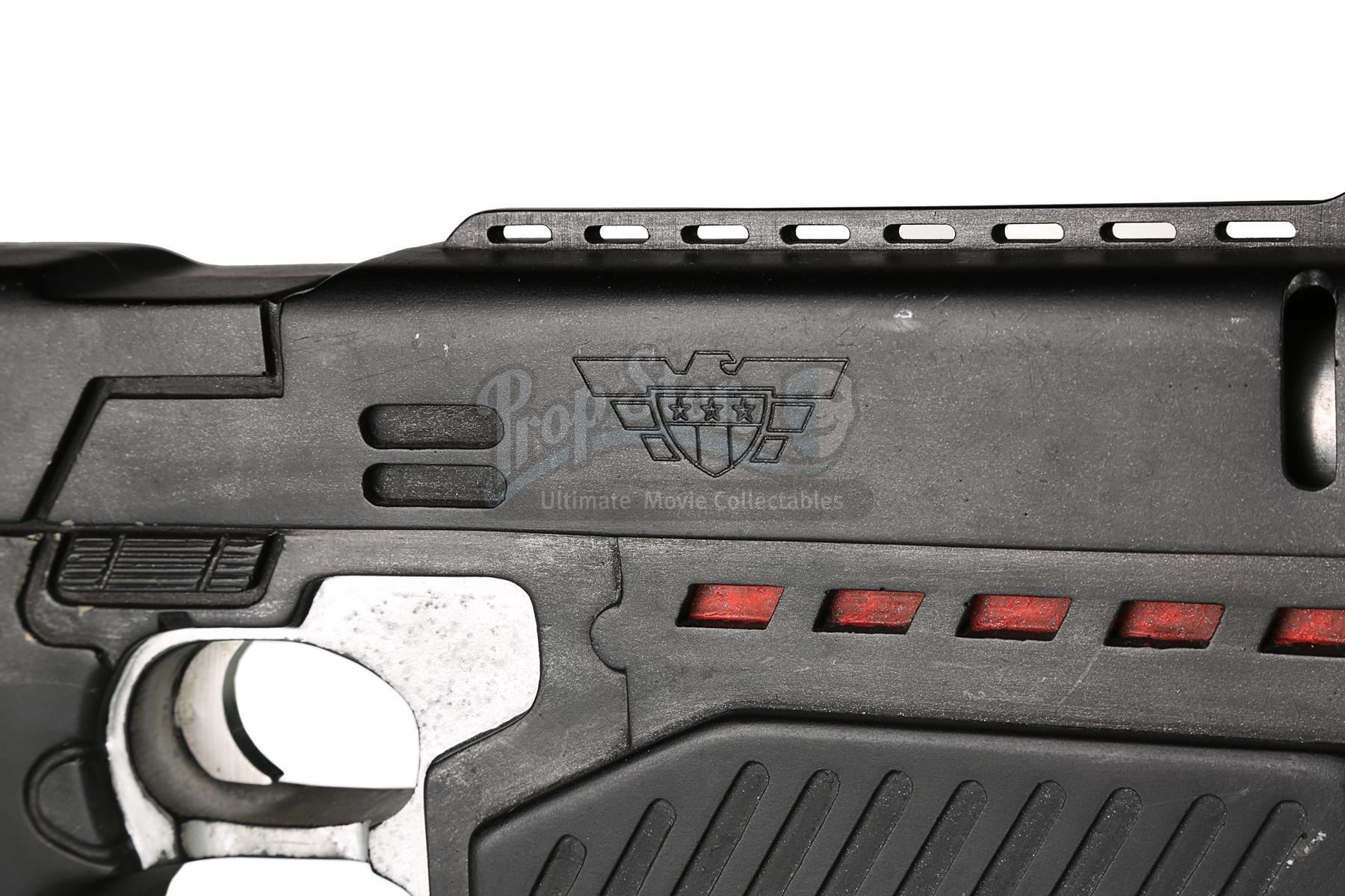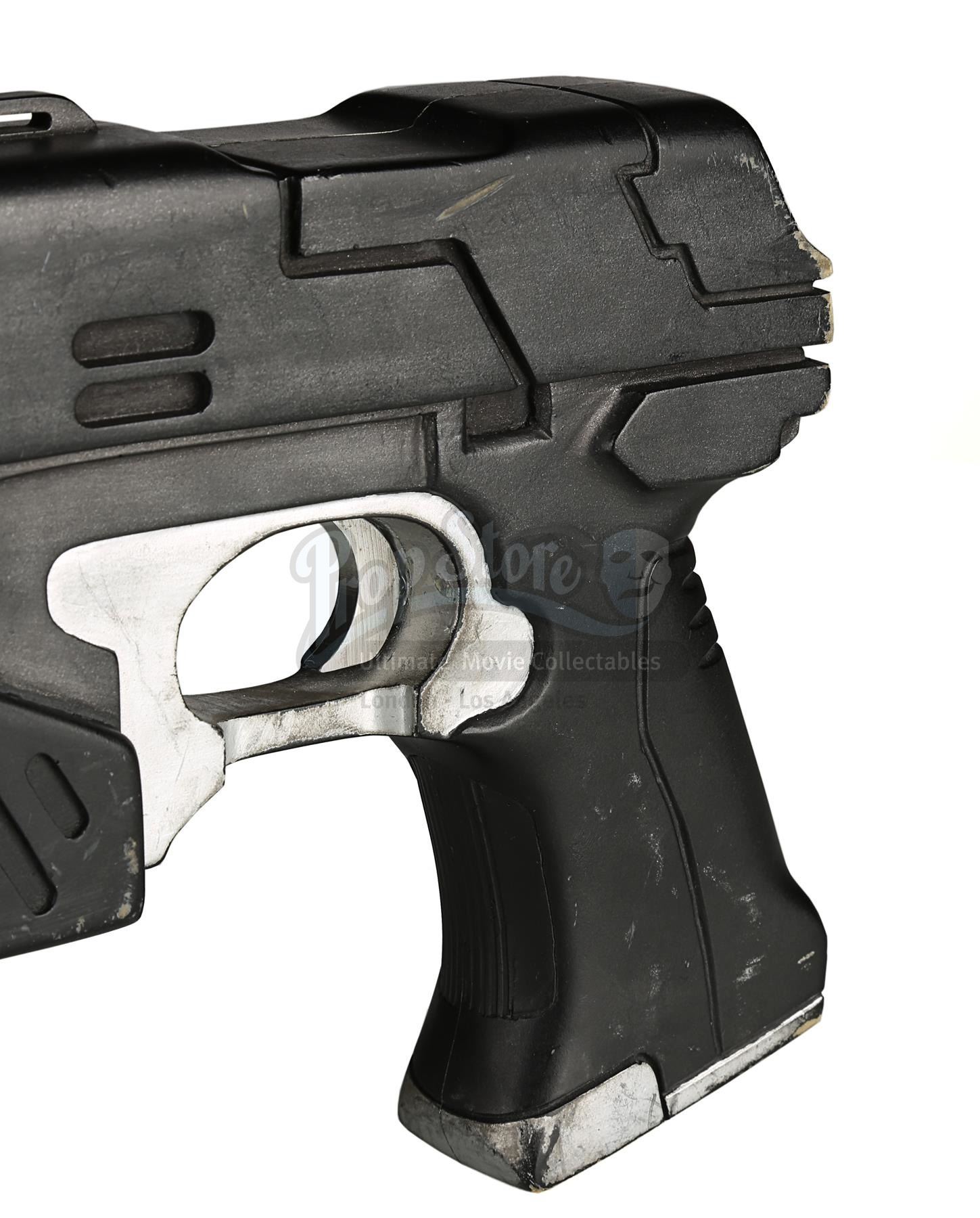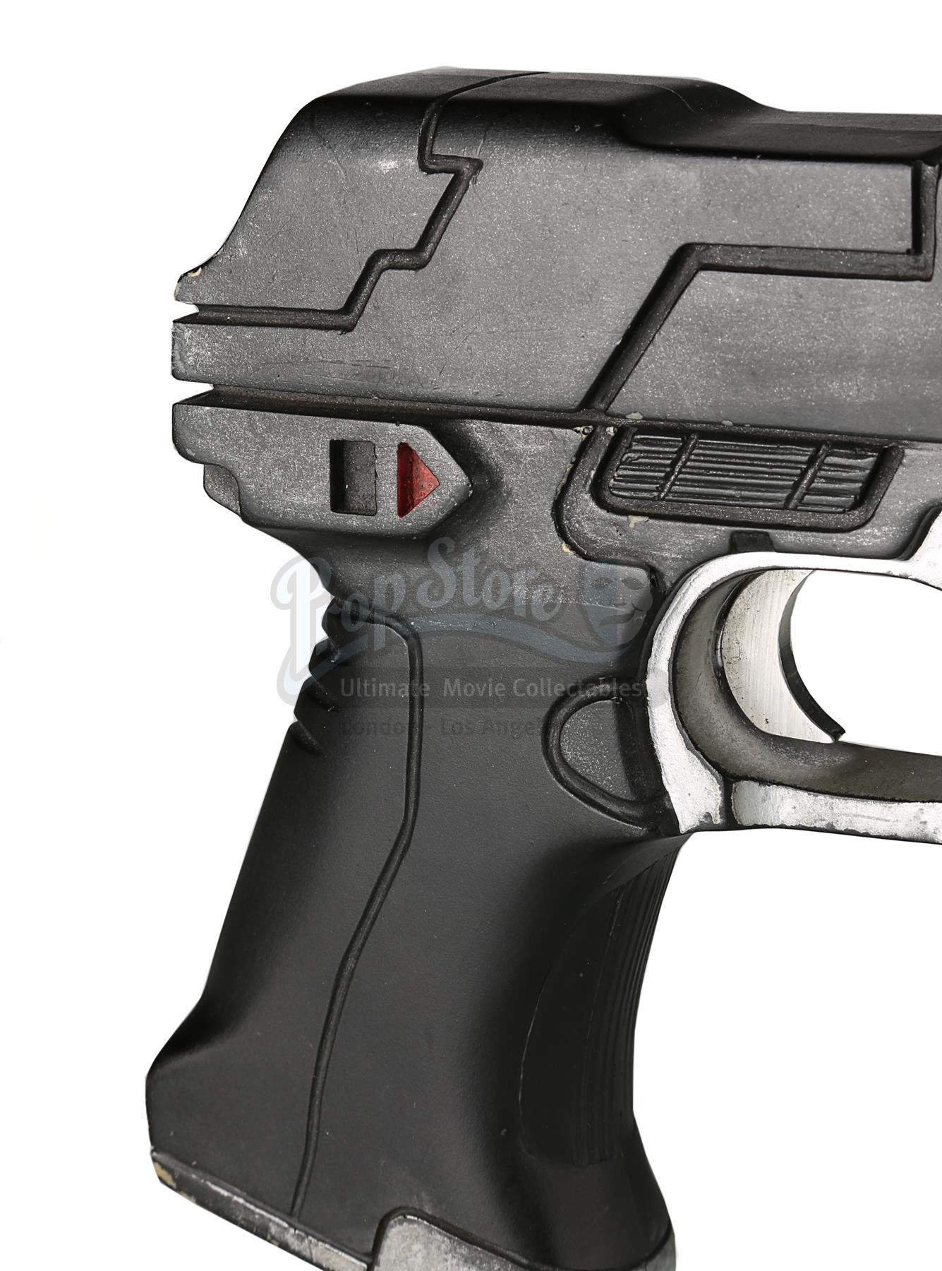 Used for scenes in which hero, live-firing Lawgivers were not required, the stunt Lawgiver is made of resin with a turned aluminium barrel. Vented detailing runs along the top and sides, with a secondary barrel below. The light panels running along the sides of the futuristic firearm have been finished in metallic red paint, with faux-silver paint on the magazine, grip and trigger housing. Displaying some scratches and minor chips on the resin, the Lawgiver remains in good condition.