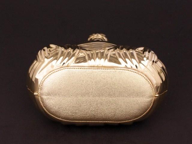Has crystal stones and rounded red garnet stones. Gold leather interior. Comes with original comb. Has hideaway strap. Comes with original box and dust cover. 18" drop. Measures 6" h X 5" w X 2 7/8" d.