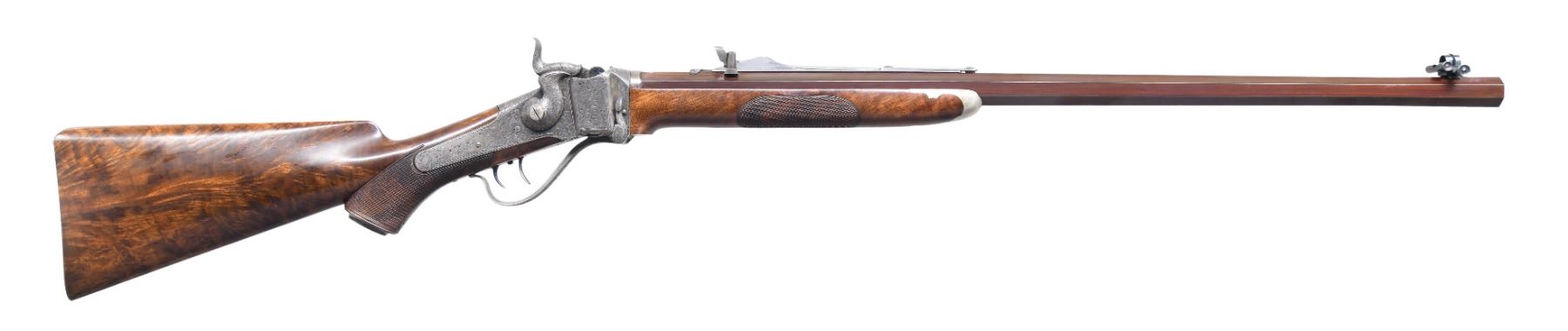 GUN" SINGLE SHOT RIFLE. Cal. 45-70 (45, 2-1/10"). NSN. Judson Brennan is an Alaskan based custom gun maker known for his ornate American Long Rifles & Kentucky style pistols. He is considered by many to be among the world's best. This Sharps rifle build by Brennan is an outstanding reproduction of the rifles built by the Freund brothers who operated the Wyoming Armory in Cheyenne during the buffalo hunting era. Frank Freund designed & patented improvement to the Sharps rifle including the breech block & sights. The finest of the Freund altered rifles known as Boss Guns had features including hand engraving & fancy wood. Today these rifles are highly sought after by Sharps collectors. The action of this rifle has nearly full coverage vine type floral engraving w/ punch dot backgrounds & fancy borders. Features include a Freund style improved breech block & double set triggers. Bbl. 28" octagon measuring 1" across flats at the muzzle. The graduated leaf peep rear sight is of Freund design paired w/ a spirit level globe front sight. German silver capped forearm & engraved steel capped pistol grip stock of exhibition grade black walnut have extensive burl with rich orange & brown tones. LOP: 14-1/4" to a steel shotgun butt plate w/ engraved peak. Weight: 10 lbs, 13 oz. CONDITION: bbl. retains over 95% browned finish showing faint edge wear. Case colored action shows soft dark colors & light carry wear lending a pleasing antique appearance. The wood retains very good finish & checkering showing an open grain check on left side of butt. Butt plate has faded browning finish showing scattered spots. Bright near excellent bore. PROVENANCE: formerly of the Frank Glenn Marsh estate collection. (25-1532/DS). MODERN. $20,000-30,000.