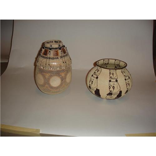2 large baskets. 1) Ring of Virtue; 1996.- Textile and mixed media sculpture. 2) UNUSUAL BLACK AND WHITE BASKET- Woven with a surround of standing bears and centered on the underside by an iron cross within key frets.