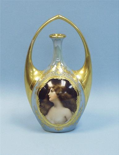 JUGENDBLUTHE. An unusual antique Old Vienna porcelain vase. The globular vessel with elongated neck, hand painted on an oval medallion with the portrait of a young lady. The turqoise ground with elaborate relief gilt decorations. Titled, hallmarked and numbered. 10 1/2" high.