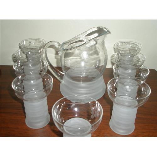 WE PRESENT TO YOU A TEN PIECE JUICE SET,SHOWING INTAGLIO ENGRAVED,ETCHED AND FROSTED GLASSES AND A PITCHER. THE CRYSTAL PITCHER HAS AN APPLIED HANDLE, FROSTED BASE ALL THE WAY AROUND OVER A STEPPED RIBBED BASE, AND A BULBOUS BODY WITH AN APPLIED HANDLE AND AN ARCHED RIM AND SPOUT. THE BODY IS MOLDED YET THE HANDLE IS A HAND-MADE BLOWN AND APPLIED PIECE. THE CRYSTAL GLASSES ARE FROM A MOLD PROCESS AS WELL WITH A MATCHING PATTERN TO THE PITCHER,THE ONLY DIFFERENCE IS THAT THERE ARE FIVE RIBBED RINGS ON THE GLASSES AND THREE ON THE PITCHER.THE WHOLE SET HAS BEEN FIRE POLISHED AND IS STUNNING. WHAT A GREAT GIFT THIS WOULD MAKE FOR SOMEONE THATS SO VERY SPECIAL!!