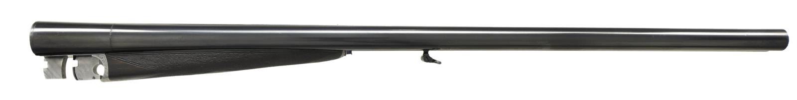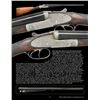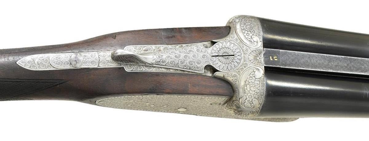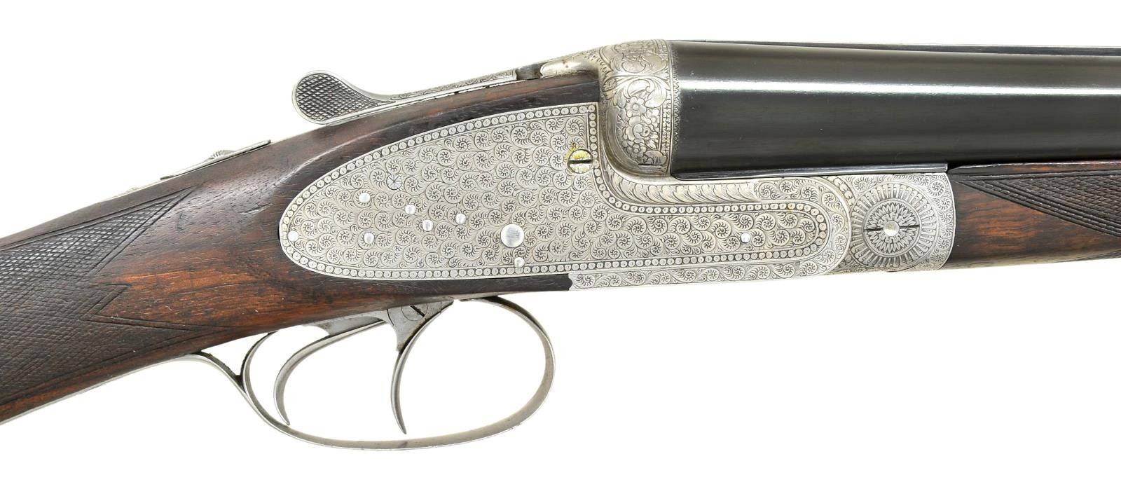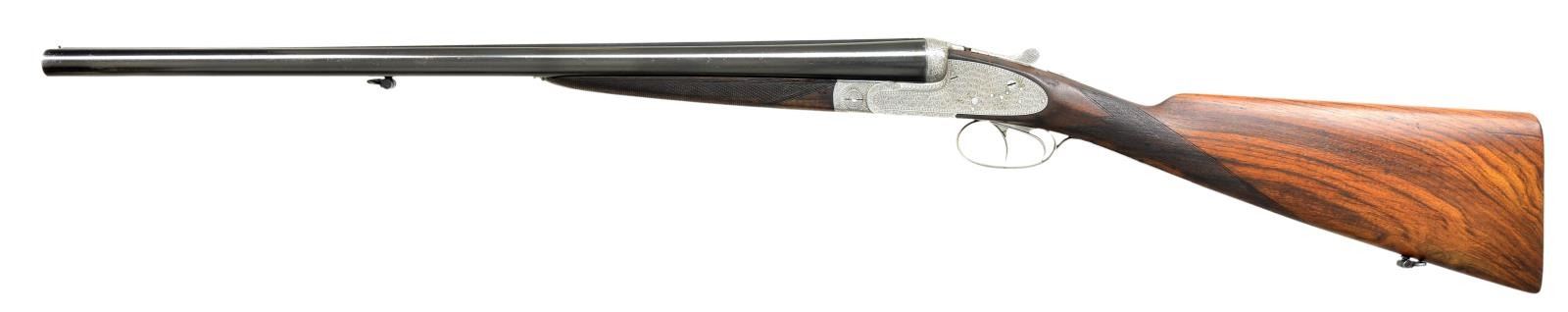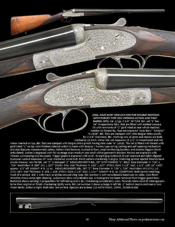 PURDEY TYPE SELF OPENING ACTION AND TWO BARREL SETS. Cal. 12 ga. 2 3/4". S# 7239. Bbl. set "2" has 24" chopperlump bbls. that are fitted with matted concave rib with remnants of "2" gold inlaid at rear which matches number on forend tip. Tops are engraved "Jules Bury" "ARQsier" "A LIEGE". Bbl. flats are stamped with 1930 Belgian Nitro proofs for 2 3/4" chambers. Bbl. markings are 18.4mm and chokes are both marked at 18.3mm. Other bbl. set measures 25 1/2", is monobloced and not maker marked on top. Bbl. flats are stamped with Belgian Nitro proofs having date code "e" (1926). This set is fitted with forend with gold inlaid "1" on tip. Coin finished sidelock action is made with Beasley / Purdey type spring cocking and self opening mechanism and also features nonautomatic safety, hidden third fastener, bushed strikers, small reinforcing bolsters, and double triggers (front articulated). Action is engraved with full coverage even medium size scroll within geometric borders. Fences are engraved with ribbons surrounding rose bouquets. Trigger guard is engraved with scroll. Straight grip buttstock of well marbled and lightly figured European walnut measures 15" over checkered wood butt. Point pattern checkering is at grip. Matching splinter ejector forends have Anson releases. Iron for bbl. set "2" is stamped "2". MEASUREMENTS BBL. SET WITH FOREND "1": BBLS: Bore Diameter: R .724", L .724". Restriction: R .008" (IC). L .027" (MOD). Min. Wall Thickness: R .028" L .027". STOCK: DAH: 2 1/8". DAC: 1 1/2". LOP: 15". CAST: approx. 1/2" off. WEIGHT: 6 lb. 11 oz. . MEASURESMENTS BBL. SET "2": Bore Diameter: R .729" L .729". Restriction: R 0 (CYL), L 0 (CYL). Min. Wall Thickness: R .029, L .029. STOCK: DAH: 2 1/4". DAC: 1 1/2+". WEIGHT: 6 lb. oz. CONDITION: Both barrels retaining most of a reblack. Bbl. 1 with many scratches around sling loop. Bbl. number 2 with considerable handwear on sides. Coin finish of action shows some light cleaning. Lockscrews show considerable use. A monogram has been removed from trigger guard bow. Buttstock shows sanding in preparation for refinishing and is dry. Checkering considerably worn. Forends retain most of what appears to be their original oil finish. Checkering lightly worn. Bbl. set number 2 shows a bulge in left bbl. 1" behind muzzle and one or two minor dents. Action is tight. Both bbls. are on face. Ejectors are in time. (22-4476/MGM). CURIO. $6,000-9,000.