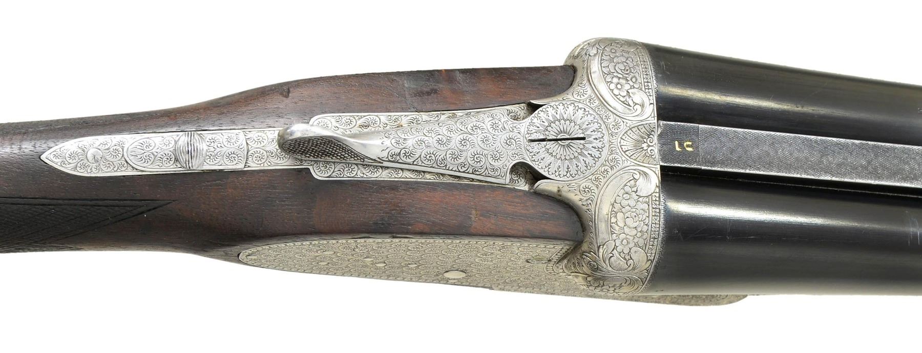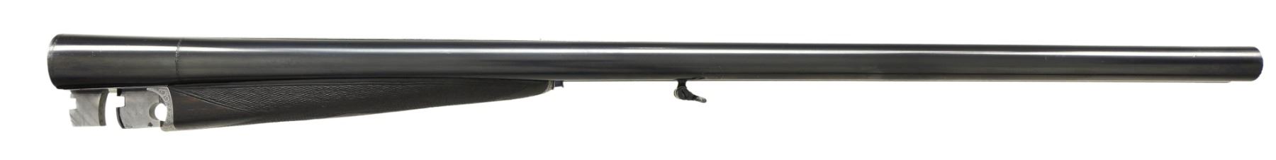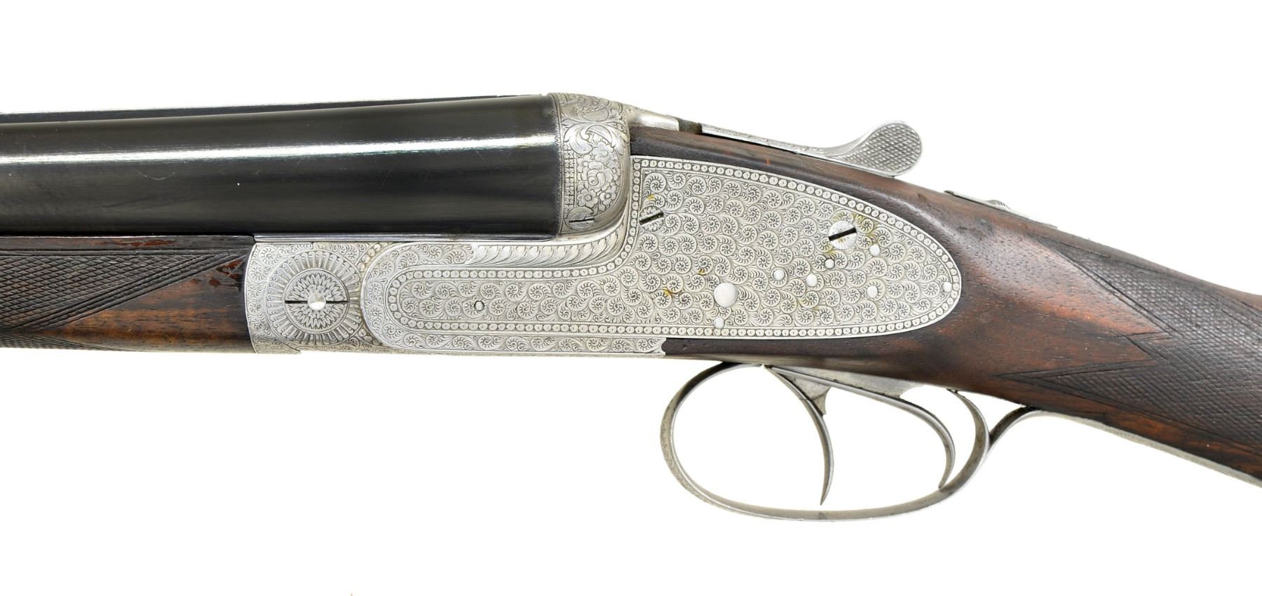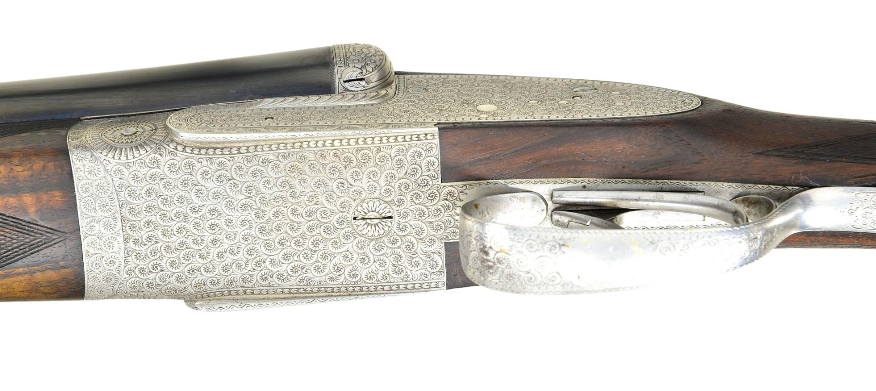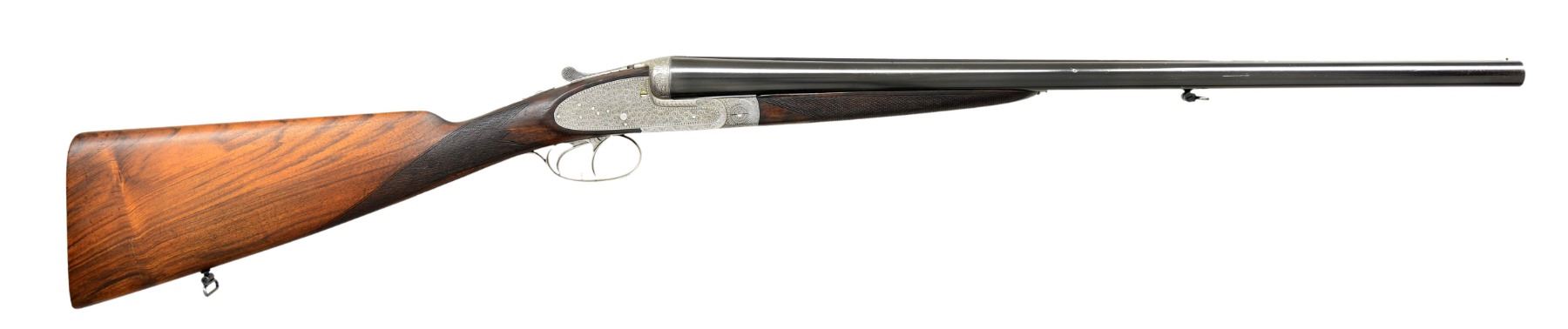 PURDEY TYPE SELF OPENING ACTION AND TWO BARREL SETS. Cal. 12 ga. 2 3/4". S# 7239. Bbl. set "2" has 24" chopperlump bbls. that are fitted with matted concave rib with remnants of "2" gold inlaid at rear which matches number on forend tip. Tops are engraved "Jules Bury" "ARQsier" "A LIEGE". Bbl. flats are stamped with 1930 Belgian Nitro proofs for 2 3/4" chambers. Bbl. markings are 18.4mm and chokes are both marked at 18.3mm. Other bbl. set measures 25 1/2", is monobloced and not maker marked on top. Bbl. flats are stamped with Belgian Nitro proofs having date code "e" (1926). This set is fitted with forend with gold inlaid "1" on tip. Coin finished sidelock action is made with Beasley / Purdey type spring cocking and self opening mechanism and also features nonautomatic safety, hidden third fastener, bushed strikers, small reinforcing bolsters, and double triggers (front articulated). Action is engraved with full coverage even medium size scroll within geometric borders. Fences are engraved with ribbons surrounding rose bouquets. Trigger guard is engraved with scroll. Straight grip buttstock of well marbled and lightly figured European walnut measures 15" over checkered wood butt. Point pattern checkering is at grip. Matching splinter ejector forends have Anson releases. Iron for bbl. set "2" is stamped "2". MEASUREMENTS BBL. SET WITH FOREND "1": BBLS: Bore Diameter: R .724", L .724". Restriction: R .008" (IC). L .027" (MOD). Min. Wall Thickness: R .028" L .027". STOCK: DAH: 2 1/8". DAC: 1 1/2". LOP: 15". CAST: approx. 1/2" off. WEIGHT: 6 lb. 11 oz. . MEASURESMENTS BBL. SET "2": Bore Diameter: R .729" L .729". Restriction: R 0 (CYL), L 0 (CYL). Min. Wall Thickness: R .029, L .029. STOCK: DAH: 2 1/4". DAC: 1 1/2+". WEIGHT: 6 lb. oz. CONDITION: Both barrels retaining most of a reblack. Bbl. 1 with many scratches around sling loop. Bbl. number 2 with considerable handwear on sides. Coin finish of action shows some light cleaning. Lockscrews show considerable use. A monogram has been removed from trigger guard bow. Buttstock shows sanding in preparation for refinishing and is dry. Checkering considerably worn. Forends retain most of what appears to be their original oil finish. Checkering lightly worn. Bbl. set number 2 shows a bulge in left bbl. 1" behind muzzle and one or two minor dents. Action is tight. Both bbls. are on face. Ejectors are in time. (22-4476/MGM). CURIO. $1,500-2,500.