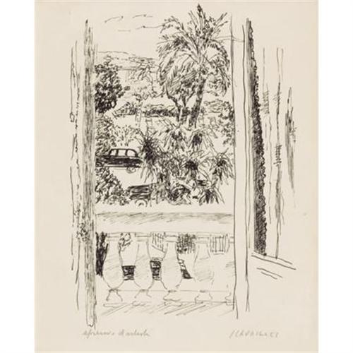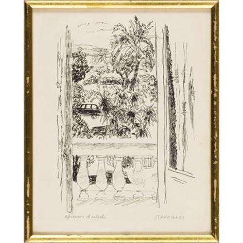 <B>JULES CAVAILLES (French, 1901-1977)</B></I><BR><I>View from the Window</B></I><BR>Ink on paper<BR>11 x 8-1/4 inches (27.9 x 21.0 cm)<BR>Signed in pencil lower right: <I>J CAVAILLES</B></I><BR> <BR>PROVENANCE:<BR>Collection of Arthur Arent<BR><B>Condition Report:</B> Toning, principally at edges, diagonal crease in lower right corner extending upwards approximately 4-1/2 inches, slight rippling of paper throughout.<BR><BR><b>Shipping:</b> Framed - with Glass, Small (<a target="_blank" href="http://www.heritageauctions.com/common/shipping.php">view shipping information</a>