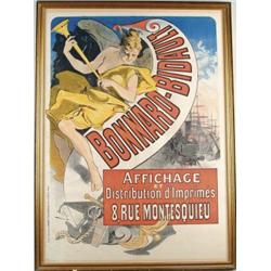JULES CHERET STONE LITHO POSTER. One sheet lithograph for “BONNARD-BIDAULT” by one of the most famous turn-of-the-century French artists. The poster advertises a company that printed and distributed advertising posters. SIZE: Image 34” w. x 48” h. CONDITION: Poster appears archivally mounted; light creases at quarter-folds; otherwise very good condition. 1-3630 (600-800)